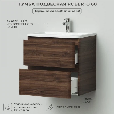 Тумба с раковиной подвесная Итана Roberto 60 с выдвижными ящиками Орех Пекан шоколад стронг