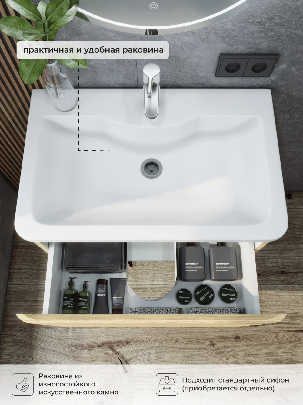 Подвесная тумба с раковиной в ванную из коллекции Roberto - это сочетание современной стилистики и богатого функционала. Тумба для ванны изготовлена из прочного МДФ, поэтому выдерживает высокие эксплуатационные нагрузки. Корпус и фасады тумбы для ванной покрыты пленкой, что обеспечивает дополнительную защиту тумбы с раковиной от влаги и перепадов температуры. Качественная фурнитура с доводчиками обеспечивает легкое открывание и плавное закрывание ящиков. Вырез под сифон универсальный, для любого типа. Благодаря своей конструкции тумба обеспечивает удобный доступ к раковине и позволяет скрыть коммуникации. Тумба с раковиной в ванную оснащена удобным ящиком для хранения, что позволяет разместить всё необходимое под рукой. Ручки интегрированы в фасад, что исключает возможность случайного удара о фурнитуру. Для точного выбора тумбы с раковиной в ванную комнату рекомендуем обратиться к схеме замеров, которая находится на фото в карточке товара, размеры изделия могут отличаться +/-1 см в связи со спецификой производства. Тумба для ванной доставляется в предварительно собранном виде, надежно упакована.