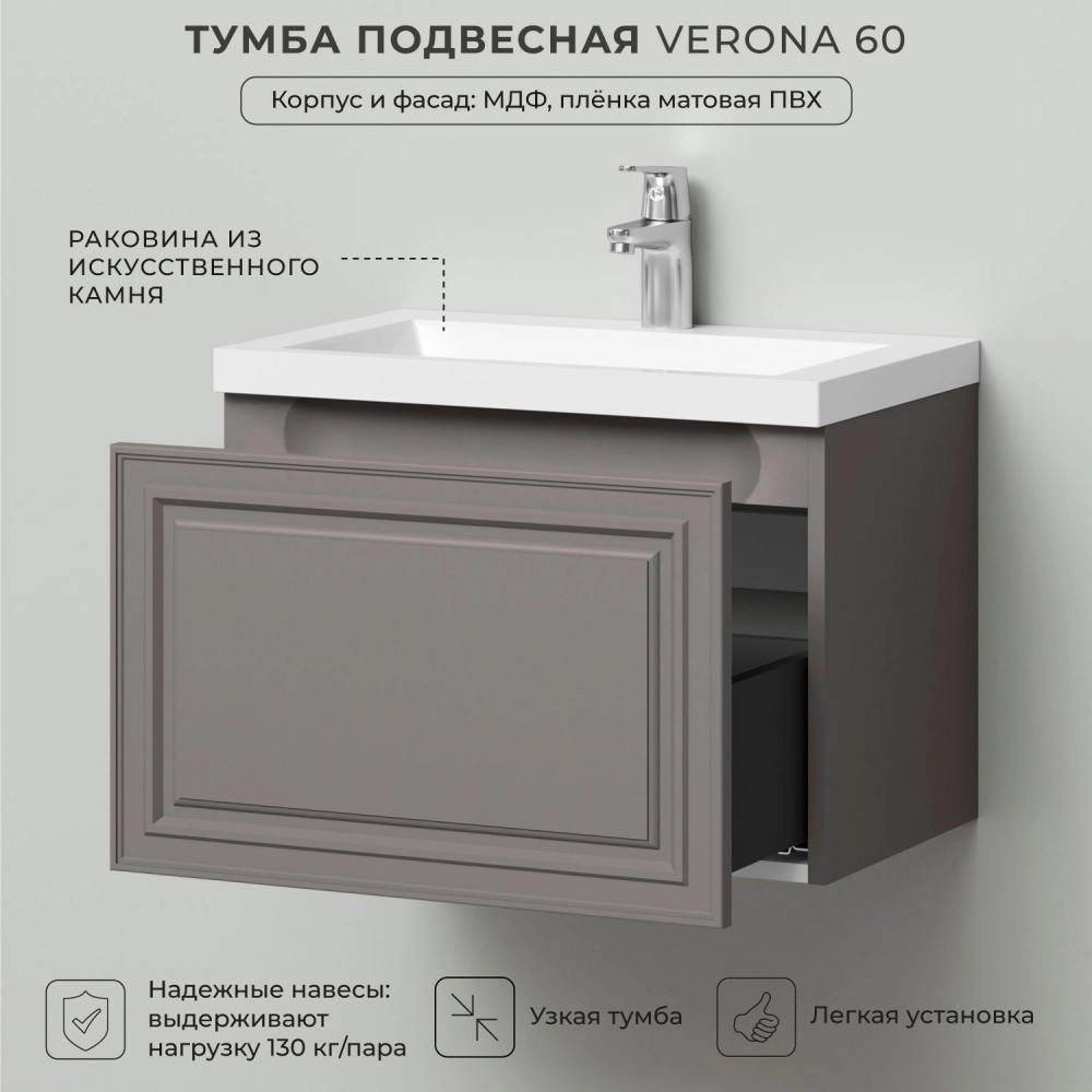 Подвесная тумба с раковиной из коллекции Verona станет настоящим украшением ванной комнаты в современном скандинавском стиле. Навесной способ установки тумбы в ванную дает возможность не только визуально увеличить пространство, но и обеспечивает быстрый и удобный доступ для уборки. Размеры подвесной тумбы с раковиной 602х377х440 - идеальный выбор для ванной комнаты или туалета. Тумба для ванны изготовлена из прочного МДФ, поэтому выдерживает высокие эксплуатационные нагрузки. Корпус и фасады тумбы для ванной покрыты матовой пленкой, что обеспечивает дополнительную защиту тумбы с раковиной от влаги и перепадов температуры. Качественная фурнитура с доводчиками обеспечивает легкое открывание и плавное закрывание ящика. Вырез под сифон универсальный, для любого типа. Благодаря своей конструкции тумба в ванную обеспечивает удобный доступ к раковине и позволяет скрыть коммуникации. Тумба с раковиной в ванную оснащена удобным ящиком для хранения, что позволяет разместить всё необходимое под рукой. Ручки интегрированы в фасад дверки шкафчика, что исключает возможность случайного удара о фурнитуру. Для точного выбора подвесной тумбы с раковиной в ванную комнату рекомендуем обратиться к схеме замеров, которая находится на третьем фото в карточке товара, размеры изделия могут отличаться +/-1 см в связи со спецификой производства. Тумба для ванной доставляется в предварительно собранном виде, надежно упакована.