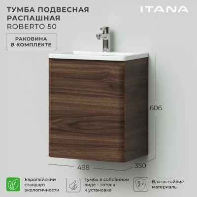 Тумба с раковиной подвесная распашная Итана Roberto 50 с распашной дверцей Орех Пекан шоколад стронг
