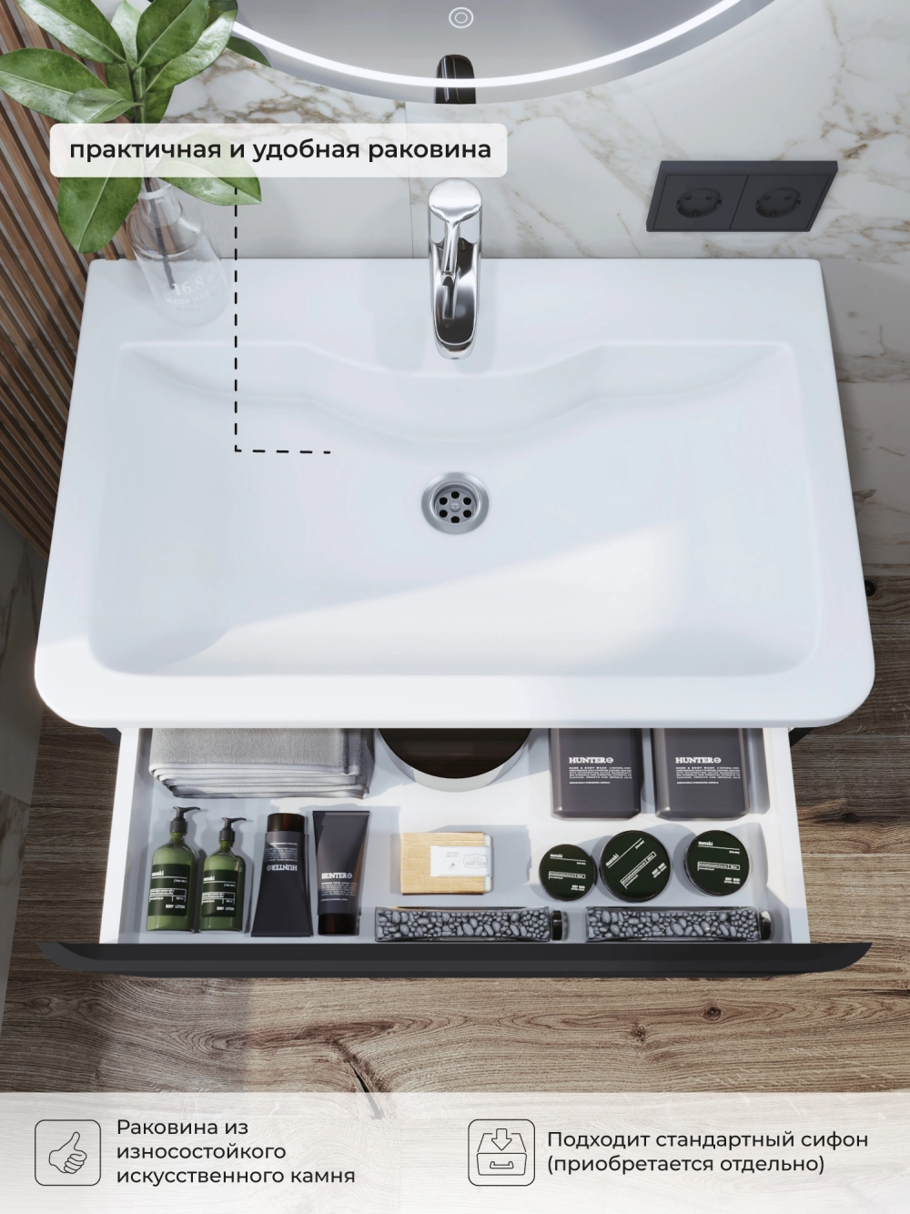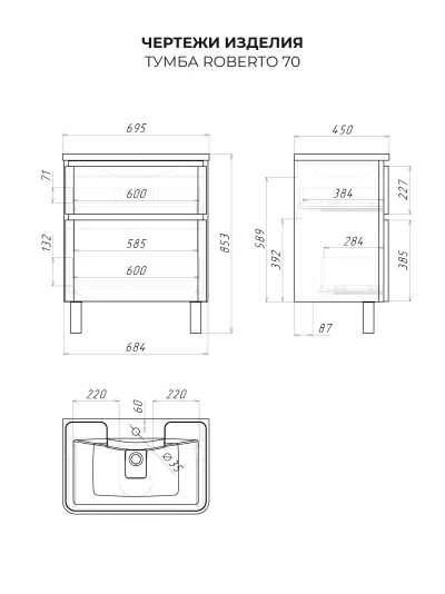 Напольная тумба с раковиной в ванную из коллекции Роберто - это сочетание современной стилистики и богатого функционала. Тумба для ванны изготовлена из прочного МДФ, поэтому выдерживает высокие эксплуатационные нагрузк и обеспечивает дополнительную защиту тумбы с раковиной от влаги и перепадов температуры. Качественная фурнитура с доводчиками обеспечивает легкое открывание и плавное закрывание ящиков. Вырез под сифон универсальный, для любого типа. Благодаря своей конструкции тумба обеспечивает удобный доступ к раковине и позволяет скрыть коммуникации. Тумба с раковиной в ванную оснащена удобным ящиком для хранения, что позволяет разместить всё необходимое под рукой. Ручки интегрированы в фасад, что исключает возможность случайного удара о фурнитуру. Для точного выбора тумбы с раковиной в ванную комнату рекомендуем обратиться к схеме замеров, которая находится на фото в карточке товара, размеры изделия могут отличаться +/-1 см в связи со спецификой производства. Тумба для ванной доставляется в предварительно собранном виде, надежно упакована.
