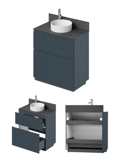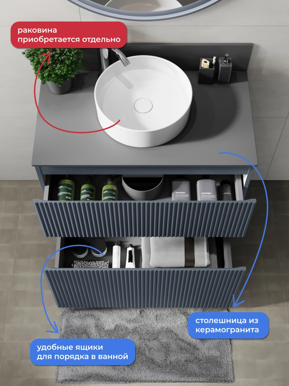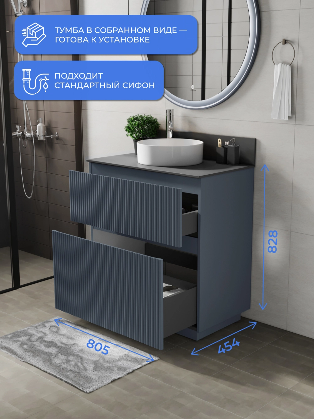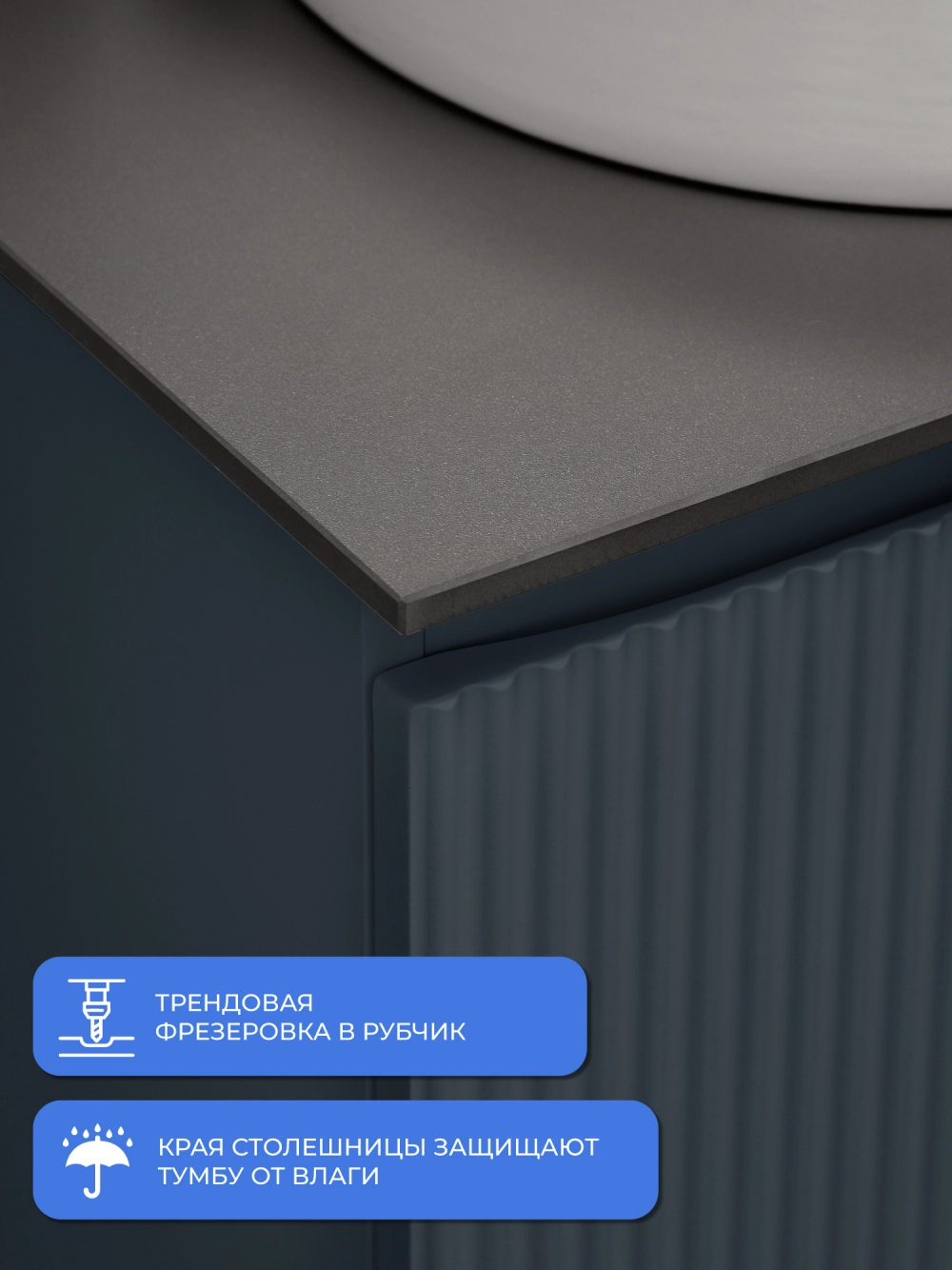 Напольная тумба со столешницей Итана Kate 80 станет идеальным дополнением для вашей ванной комнаты, сочетая в себе стильный дизайн и функциональность. Коллекция Kate - воплотила в себе тренд на фактурные фасады. Идеальный "рубчик" - простое и стильное дизайнерское решение для декорирования фасадов - эта мебель бесспорно станет украшением современной ванной комнаты. Тумба изготовлена из высококачественных материалов, гарантируя долговечность и надежность эксплуатации. Удобные фрезерованные ручки, качественная фурнитура с доводчиками, вместительность - мы продумали все, чтобы тумба под раковину была не просто красивой, но еще и функциональной, приятной в использовании. Ее конструкция позволяет легко поддерживать порядок в ванной, ведь все мелочи будут аккуратно убраны. Столешница выполнена из керамогранита, обладая устойчивостью к механическим повреждениям и влиянию химических средств. Стильный декор тумбы со столешницей добавляет изюминку в общий дизайн, вписываясь в современные и классические интерьеры. Удобные выдвижные ящики и полки обеспечивают простоту доступа к содержимому тумбы. Безупречное сочетание столешницы с тумбой подчеркивает общий стиль вашей ванной комнаты, делая ее уютной и функциональной. Для точного выбора тумбочки со столешницей в ванную комнату рекомендуем обратиться к схеме замеров, которая находится на фото в карточке товара, размеры изделия могут отличаться +/-1 см в связи со спецификой производства. Тумба для ванной доставляется в предварительно собранном виде, надежно упакована.