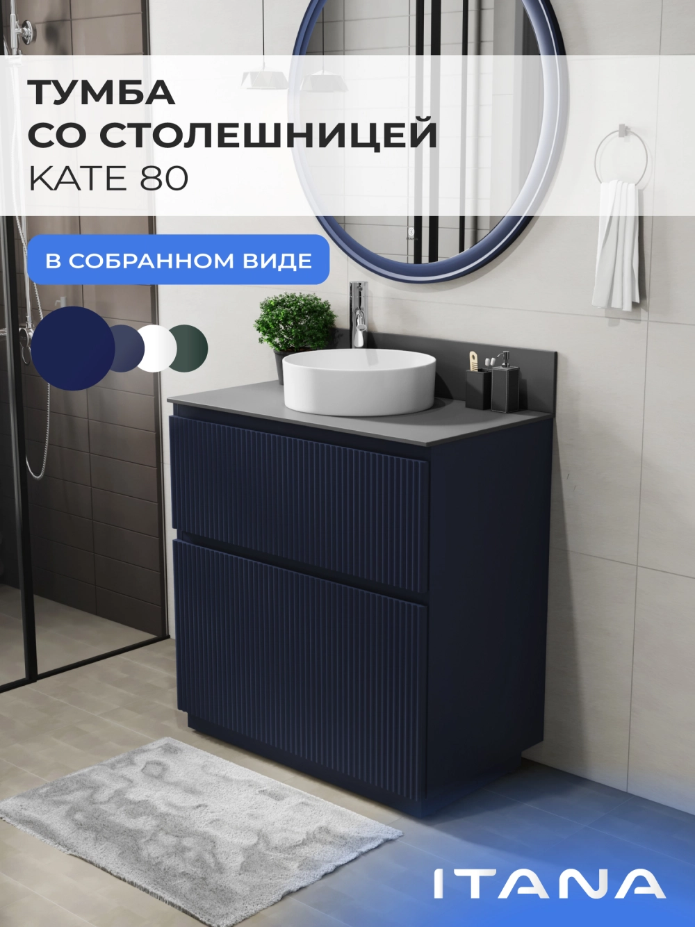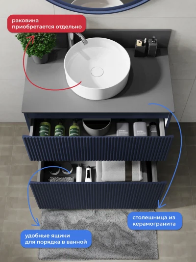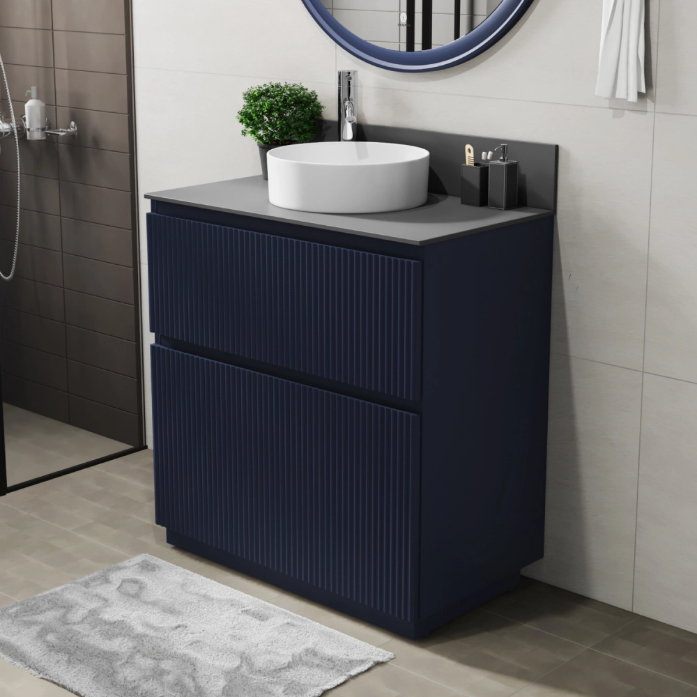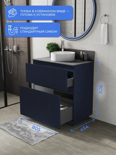 Напольная тумба со столешницей Итана Kate 80 станет идеальным дополнением для вашей ванной комнаты, сочетая в себе стильный дизайн и функциональность. Коллекция Kate - воплотила в себе тренд на фактурные фасады. Идеальный "рубчик" - простое и стильное дизайнерское решение для декорирования фасадов - эта мебель бесспорно станет украшением современной ванной комнаты. Тумба изготовлена из высококачественных материалов, гарантируя долговечность и надежность эксплуатации. Удобные фрезерованные ручки, качественная фурнитура с доводчиками, вместительность - мы продумали все, чтобы тумба под раковину была не просто красивой, но еще и функциональной, приятной в использовании. Ее конструкция позволяет легко поддерживать порядок в ванной, ведь все мелочи будут аккуратно убраны. Столешница выполнена из керамогранита, обладая устойчивостью к механическим повреждениям и влиянию химических средств. Стильный декор тумбы со столешницей добавляет изюминку в общий дизайн, вписываясь в современные и классические интерьеры. Удобные выдвижные ящики и полки обеспечивают простоту доступа к содержимому тумбы. Безупречное сочетание столешницы с тумбой подчеркивает общий стиль вашей ванной комнаты, делая ее уютной и функциональной. Для точного выбора тумбочки со столешницей в ванную комнату рекомендуем обратиться к схеме замеров, которая находится на фото в карточке товара, размеры изделия могут отличаться +/-1 см в связи со спецификой производства. Тумба для ванной доставляется в предварительно собранном виде, надежно упакована.