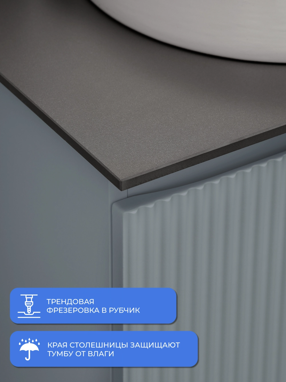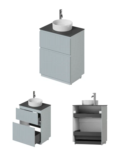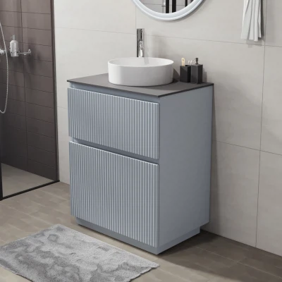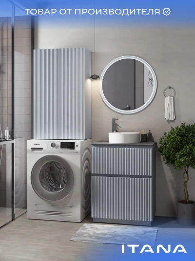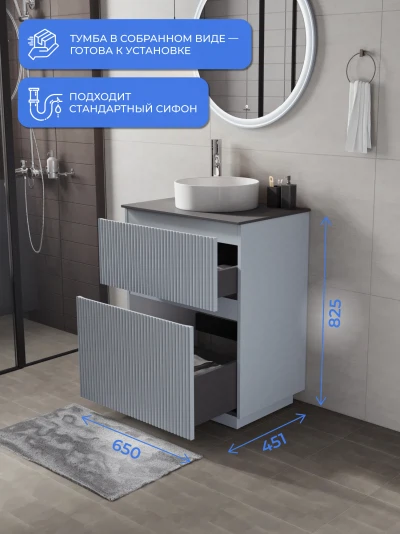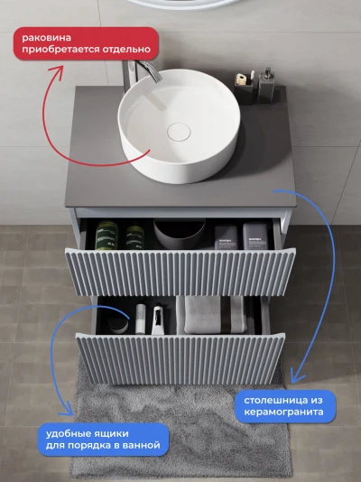 Напольная тумба со столешницей Итана Кейт 65 станет идеальным дополнением для вашей ванной комнаты, сочетая в себе стильный дизайн и функциональность. Коллекция Кейт - воплотила в себе тренд на фактурные фасады. Идеальный "рубчик" - простое и стильное дизайнерское решение для декорирования фасадов - эта мебель бесспорно станет украшением современной ванной комнаты. Тумба изготовлена из высококачественных материалов, гарантируя долговечность и надежность эксплуатации. Удобные фрезерованные ручки, качественная фурнитура с доводчиками, вместительность - мы продумали все, чтобы тумба под раковину была не просто красивой, но еще и функциональной, приятной в использовании. Ее конструкция позволяет легко поддерживать порядок в ванной, ведь все мелочи будут аккуратно убраны. Столешница выполнена из керамогранита, обладая устойчивостью к механическим повреждениям и влиянию химических средств. Стильный декор тумбы со столешницей добавляет изюминку в общий дизайн, вписываясь в современные и классические интерьеры. Удобные выдвижные ящики и полки обеспечивают простоту доступа к содержимому тумбы. Безупречное сочетание столешницы с тумбой подчеркивает общий стиль вашей ванной комнаты, делая ее уютной и функциональной. Для точного выбора тумбочки со столешницей в ванную комнату рекомендуем обратиться к схеме замеров, которая находится на фото в карточке товара, размеры изделия могут отличаться +/-1 см в связи со спецификой производства. Тумба для ванной доставляется в предварительно собранном виде, надежно упакована.
