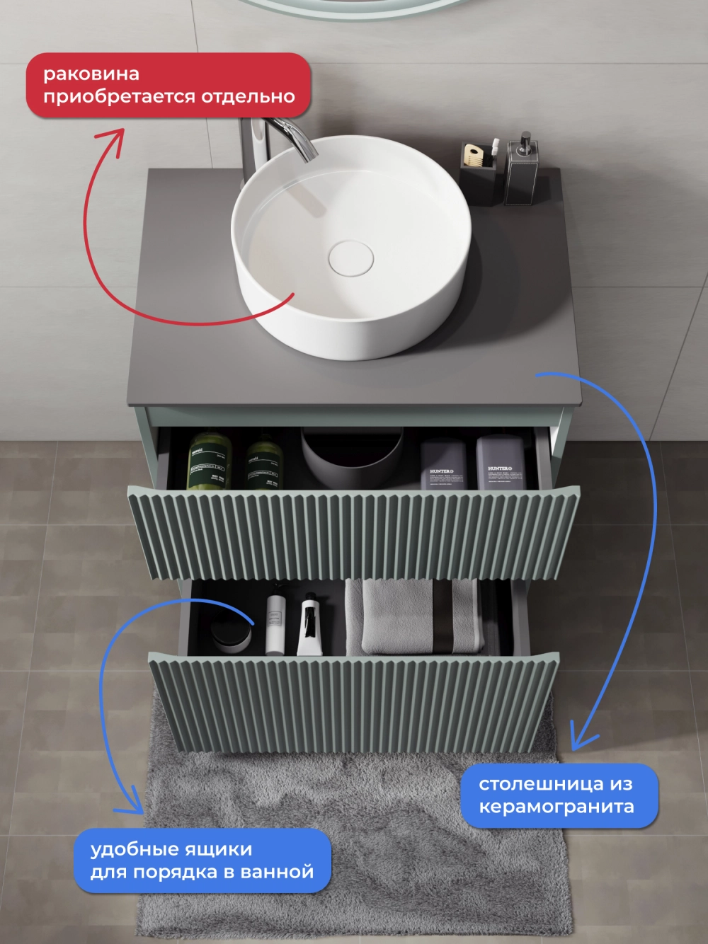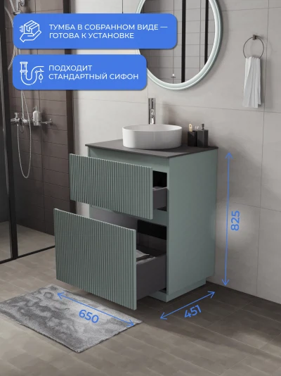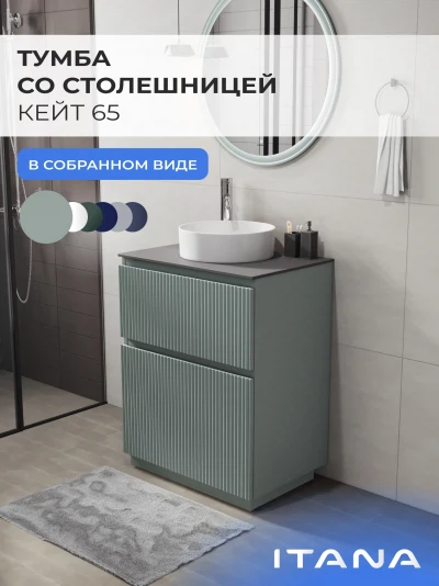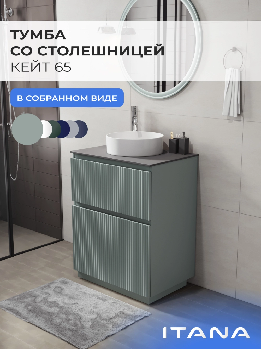 Напольная тумба со столешницей Итана Кейт 65 станет идеальным дополнением для вашей ванной комнаты, сочетая в себе стильный дизайн и функциональность. Коллекция Кейт - воплотила в себе тренд на фактурные фасады. Идеальный "рубчик" - простое и стильное дизайнерское решение для декорирования фасадов - эта мебель бесспорно станет украшением современной ванной комнаты. Тумба изготовлена из высококачественных материалов, гарантируя долговечность и надежность эксплуатации. Удобные фрезерованные ручки, качественная фурнитура с доводчиками, вместительность - мы продумали все, чтобы тумба под раковину была не просто красивой, но еще и функциональной, приятной в использовании. Ее конструкция позволяет легко поддерживать порядок в ванной, ведь все мелочи будут аккуратно убраны. Столешница выполнена из керамогранита, обладая устойчивостью к механическим повреждениям и влиянию химических средств. Стильный декор тумбы со столешницей добавляет изюминку в общий дизайн, вписываясь в современные и классические интерьеры. Удобные выдвижные ящики и полки обеспечивают простоту доступа к содержимому тумбы. Безупречное сочетание столешницы с тумбой подчеркивает общий стиль вашей ванной комнаты, делая ее уютной и функциональной. Для точного выбора тумбочки со столешницей в ванную комнату рекомендуем обратиться к схеме замеров, которая находится на фото в карточке товара, размеры изделия могут отличаться +/-1 см в связи со спецификой производства. Тумба для ванной доставляется в предварительно собранном виде, надежно упакована.
