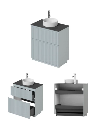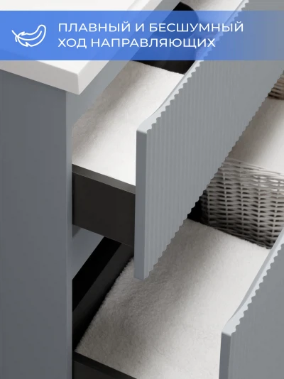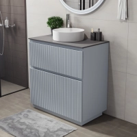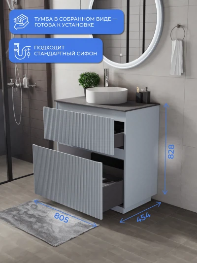 Напольная тумба со столешницей Итана Кейт 80 станет идеальным дополнением для вашей ванной комнаты, сочетая в себе стильный дизайн и функциональность. Коллекция Кейт - воплотила в себе тренд на фактурные фасады. Идеальный "рубчик" - простое и стильное дизайнерское решение для декорирования фасадов - эта мебель бесспорно станет украшением современной ванной комнаты. Тумба изготовлена из высококачественных материалов, гарантируя долговечность и надежность эксплуатации. Удобные фрезерованные ручки, качественная фурнитура с доводчиками, вместительность - мы продумали все, чтобы тумба под раковину была не просто красивой, но еще и функциональной, приятной в использовании. Ее конструкция позволяет легко поддерживать порядок в ванной, ведь все мелочи будут аккуратно убраны. Столешница выполнена из керамогранита, обладая устойчивостью к механическим повреждениям и влиянию химических средств. Стильный декор тумбы со столешницей добавляет изюминку в общий дизайн, вписываясь в современные и классические интерьеры. Удобные выдвижные ящики и полки обеспечивают простоту доступа к содержимому тумбы. Безупречное сочетание столешницы с тумбой подчеркивает общий стиль вашей ванной комнаты, делая ее уютной и функциональной. Для точного выбора тумбочки со столешницей в ванную комнату рекомендуем обратиться к схеме замеров, которая находится на фото в карточке товара, размеры изделия могут отличаться +/-1 см в связи со спецификой производства. Тумба для ванной доставляется в предварительно собранном виде, надежно упакована.