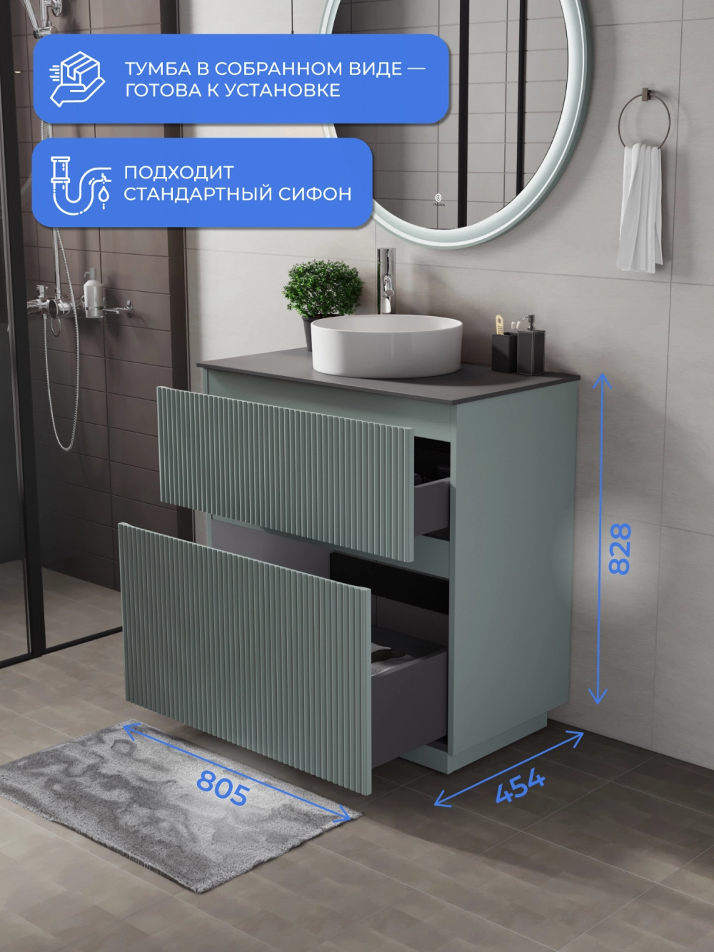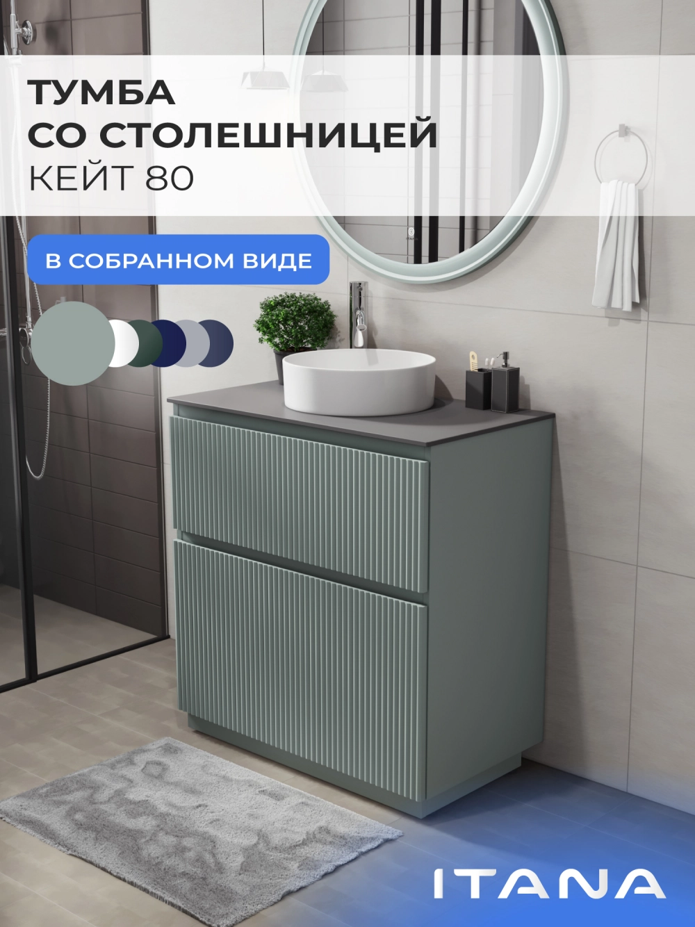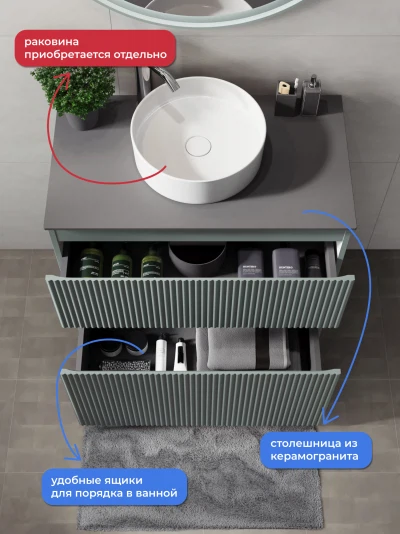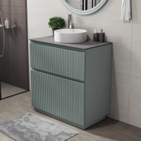 Напольная тумба со столешницей Итана Кейт 80 станет идеальным дополнением для вашей ванной комнаты, сочетая в себе стильный дизайн и функциональность. Коллекция Кейт - воплотила в себе тренд на фактурные фасады. Идеальный "рубчик" - простое и стильное дизайнерское решение для декорирования фасадов - эта мебель бесспорно станет украшением современной ванной комнаты. Тумба изготовлена из высококачественных материалов, гарантируя долговечность и надежность эксплуатации. Удобные фрезерованные ручки, качественная фурнитура с доводчиками, вместительность - мы продумали все, чтобы тумба под раковину была не просто красивой, но еще и функциональной, приятной в использовании. Ее конструкция позволяет легко поддерживать порядок в ванной, ведь все мелочи будут аккуратно убраны. Столешница выполнена из керамогранита, обладая устойчивостью к механическим повреждениям и влиянию химических средств. Стильный декор тумбы со столешницей добавляет изюминку в общий дизайн, вписываясь в современные и классические интерьеры. Удобные выдвижные ящики и полки обеспечивают простоту доступа к содержимому тумбы. Безупречное сочетание столешницы с тумбой подчеркивает общий стиль вашей ванной комнаты, делая ее уютной и функциональной. Для точного выбора тумбочки со столешницей в ванную комнату рекомендуем обратиться к схеме замеров, которая находится на фото в карточке товара, размеры изделия могут отличаться +/-1 см в связи со спецификой производства. Тумба для ванной доставляется в предварительно собранном виде, надежно упакована.