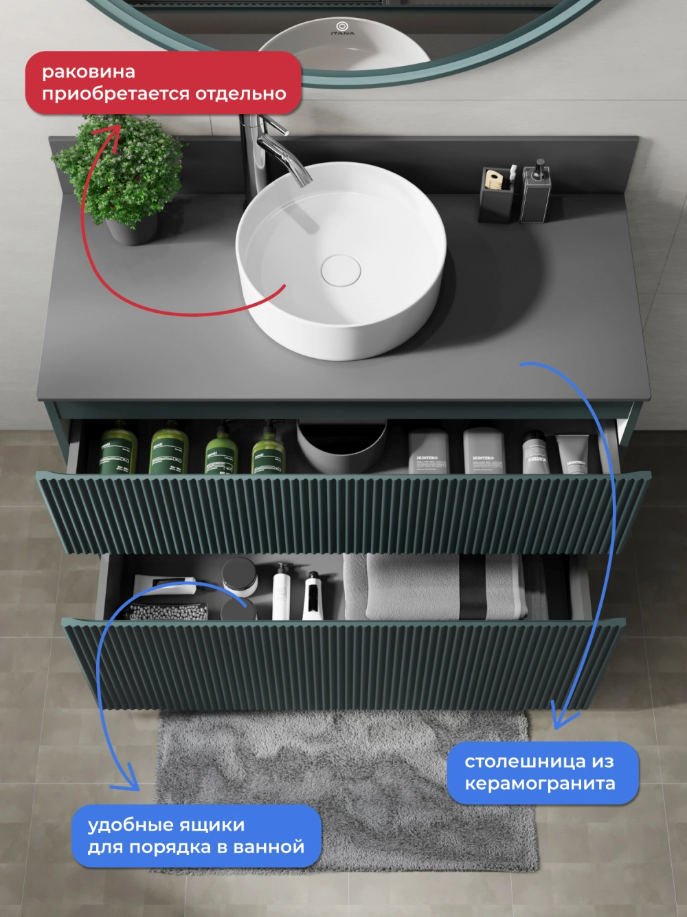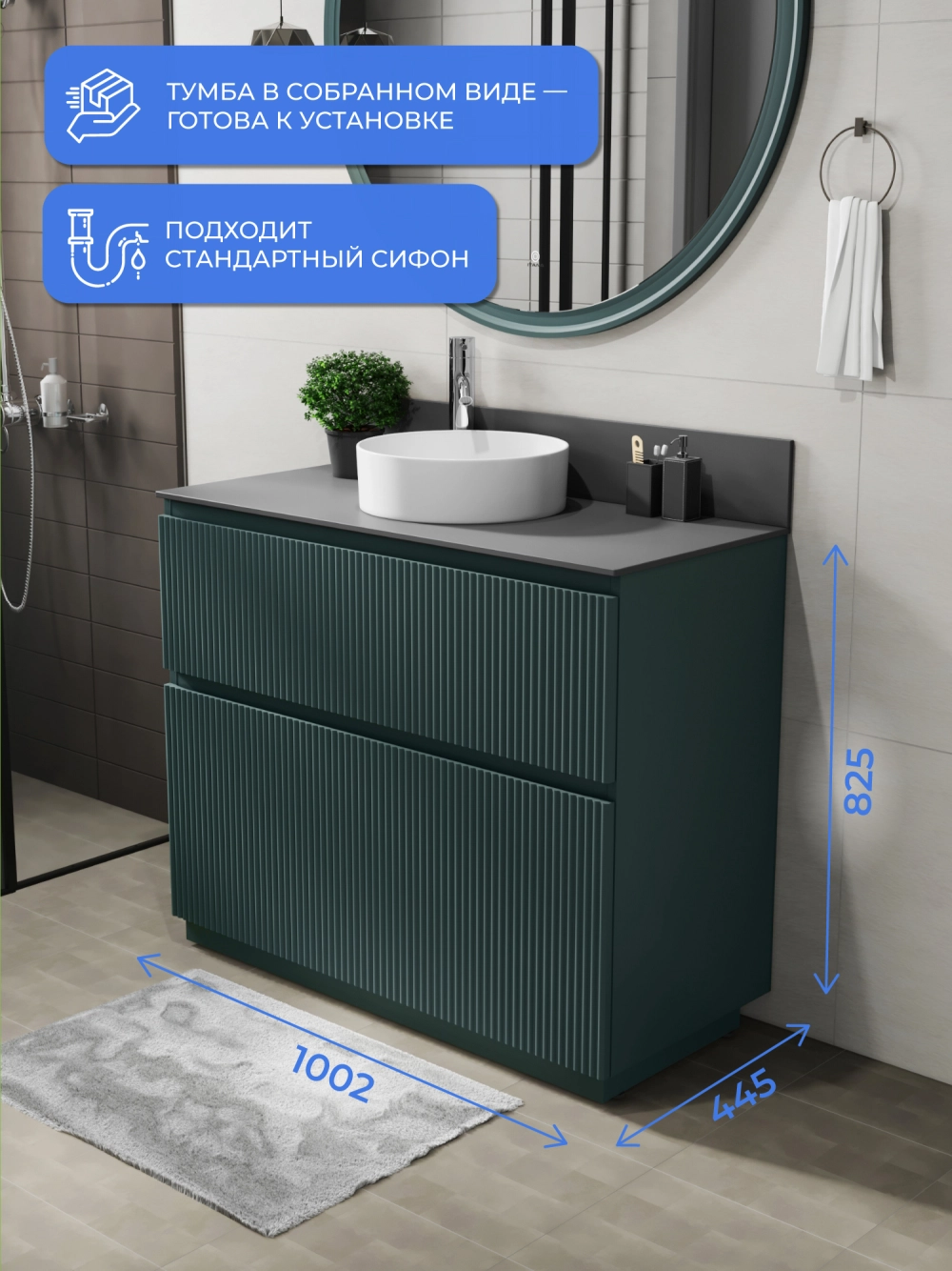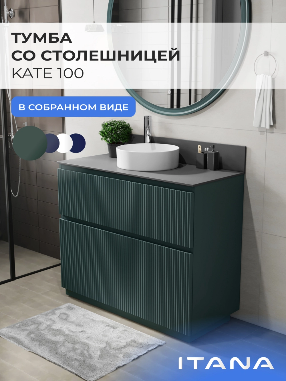Напольная тумба со столешницей Итана Kate 100 станет идеальным дополнением для вашей ванной комнаты, сочетая в себе стильный дизайн и функциональность. Коллекция Kate - воплотила в себе тренд на фактурные фасады. Идеальный "рубчик" - простое и стильное дизайнерское решение для декорирования фасадов - эта мебель бесспорно станет украшением современной ванной комнаты. Тумба изготовлена из высококачественных материалов, гарантируя долговечность и надежность эксплуатации. Удобные фрезерованные ручки, качественная фурнитура с доводчиками, вместительность - мы продумали все, чтобы тумба под раковину была не просто красивой, но еще и функциональной, приятной в использовании. Ее конструкция позволяет легко поддерживать порядок в ванной, ведь все мелочи будут аккуратно убраны. Столешница выполнена из керамогранита, обладая устойчивостью к механическим повреждениям и влиянию химических средств. Стильный декор тумбы со столешницей добавляет изюминку в общий дизайн, вписываясь в современные и классические интерьеры. Удобные выдвижные ящики и полки обеспечивают простоту доступа к содержимому тумбы. Безупречное сочетание столешницы с тумбой подчеркивает общий стиль вашей ванной комнаты, делая ее уютной и функциональной. Для точного выбора тумбочки со столешницей в ванную комнату рекомендуем обратиться к схеме замеров, которая находится на фото в карточке товара, размеры изделия могут отличаться +/-1 см в связи со спецификой производства. Тумба для ванной доставляется в предварительно собранном виде, надежно упакована.