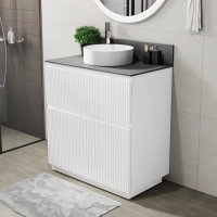 Напольная тумба со столешницей Итана Kate 80 станет идеальным дополнением для вашей ванной комнаты, сочетая в себе стильный дизайн и функциональность. Коллекция Kate - воплотила в себе тренд на фактурные фасады. Идеальный "рубчик" - простое и стильное дизайнерское решение для декорирования фасадов - эта мебель бесспорно станет украшением современной ванной комнаты. Тумба изготовлена из высококачественных материалов, гарантируя долговечность и надежность эксплуатации. Удобные фрезерованные ручки, качественная фурнитура с доводчиками, вместительность - мы продумали все, чтобы тумба под раковину была не просто красивой, но еще и функциональной, приятной в использовании. Ее конструкция позволяет легко поддерживать порядок в ванной, ведь все мелочи будут аккуратно убраны. Столешница выполнена из керамогранита, обладая устойчивостью к механическим повреждениям и влиянию химических средств. Стильный декор тумбы со столешницей добавляет изюминку в общий дизайн, вписываясь в современные и классические интерьеры. Удобные выдвижные ящики и полки обеспечивают простоту доступа к содержимому тумбы. Безупречное сочетание столешницы с тумбой подчеркивает общий стиль вашей ванной комнаты, делая ее уютной и функциональной. Для точного выбора тумбочки со столешницей в ванную комнату рекомендуем обратиться к схеме замеров, которая находится на фото в карточке товара, размеры изделия могут отличаться +/-1 см в связи со спецификой производства. Тумба для ванной доставляется в предварительно собранном виде, надежно упакована.