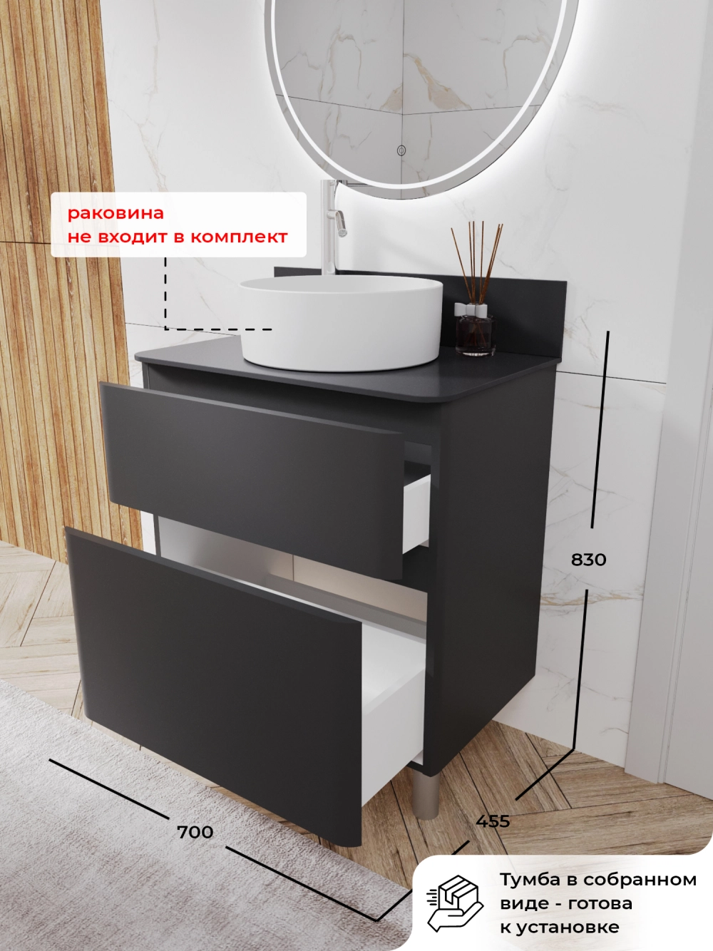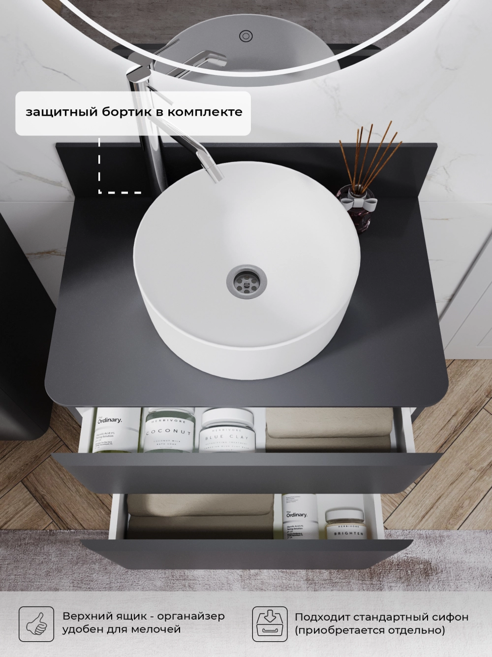 Напольная тумба со столешницей в ванную из коллекции Roberto - это сочетание современной стилистики и богатого функционала. Тумба для ванны изготовлена из прочного МДФ, поэтому выдерживает высокие эксплуатационные нагрузки и обеспечивает дополнительную защиту тумбы со столешницей от влаги и перепадов температуры. Качественная фурнитура с доводчиками обеспечивает легкое открывание и плавное закрывание ящиков. Вырез под сифон универсальный, для любого типа. Благодаря своей конструкции тумба обеспечивает удобный доступ к раковине и позволяет скрыть коммуникации. Тумба со столешницей в ванную оснащена удобным ящиком для хранения, что позволяет разместить всё необходимое под рукой. Ручки интегрированы в фасад, что исключает возможность случайного удара о фурнитуру. Для точного выбора тумбы со столешницей в ванную комнату рекомендуем обратиться к схеме замеров, которая находится на фото в карточке товара, размеры изделия могут отличаться +/-1 см в связи со спецификой производства. Тумба для ванной доставляется в предварительно собранном виде, надежно упакована.