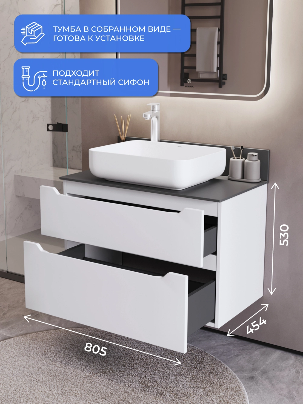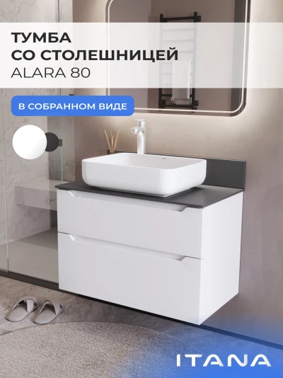 Тумба со столешницей подвесная Итана Alara 80 с выдвижными ящиками Белый Глянец