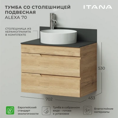 Тумба со столешницей подвесная Итана Alexa 70 с выдвижными ящиками Дуб Мавелла Голд
