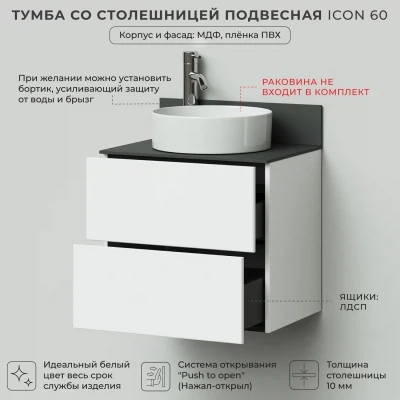 Тумба со столешницей подвесная Итана Icon 60 с выдвижными ящиками Белый глянец