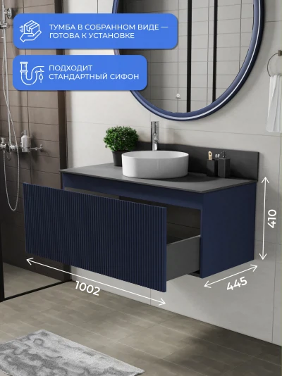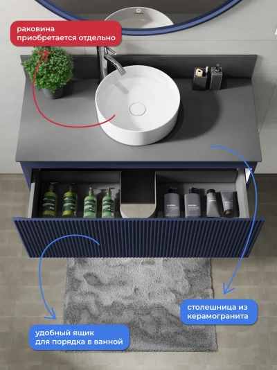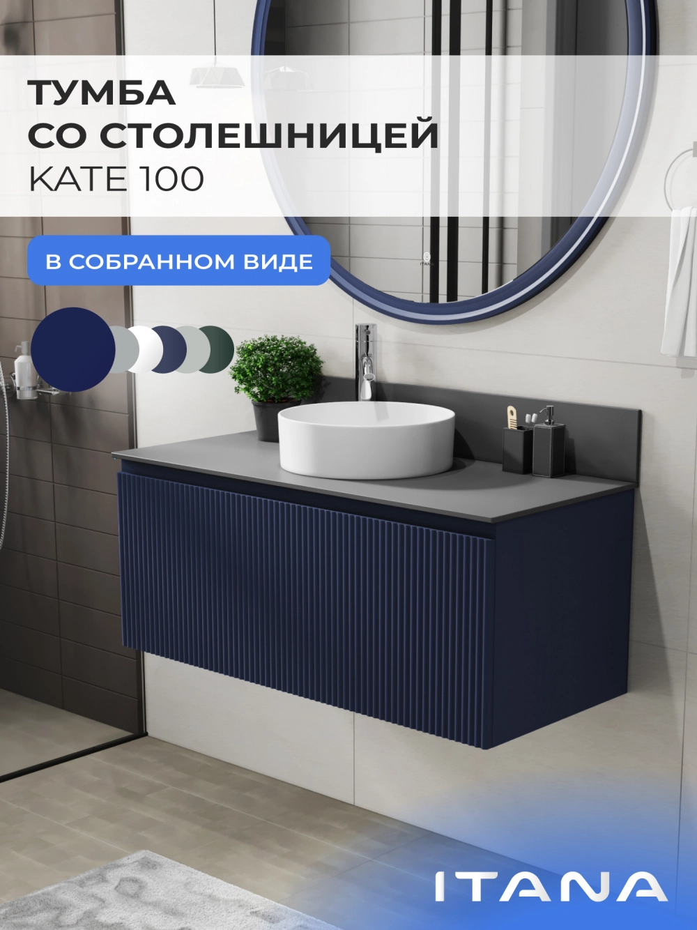 Подвесная тумба со столешницей Итана Kate 100 станет идеальным дополнением для вашей ванной комнаты, сочетая в себе стильный дизайн и функциональность. Коллекция Kate - воплотила в себе тренд на фактурные фасады. Идеальный "рубчик" - простое и стильное дизайнерское решение для декорирования фасадов - эта мебель бесспорно станет украшением современной ванной комнаты. Элегантная подвесная конструкция позволяет максимально эффективно использовать пространство, создавая ощущение легкости и визуальной свободы в интерьере. Благодаря компактным габаритам тумба идеально подходит даже для небольших ванных комнат, при этом предоставляя достаточно места для хранения необходимых принадлежностей. Тумба изготовлена из высококачественных материалов, гарантируя долговечность и надежность эксплуатации. Удобные фрезерованные ручки, качественная фурнитура с доводчиками, вместительность - мы продумали все, чтобы тумба под раковину была не просто красивой, но еще и функциональной, приятной в использовании. Ее конструкция позволяет легко поддерживать порядок в ванной, ведь все мелочи будут аккуратно убраны. Столешница выполнена из керамогранита, обладая устойчивостью к механическим повреждениям и влиянию химических средств. Стильный декор тумбы со столешницей добавляет изюминку в общий дизайн, вписываясь в современные и классические интерьеры. Подвесная тумба для ванной Итана Kate 100 — это также безопасность и удобство в уборке, так как свободное пространство под ней позволяет легко очистить пол. Безупречное сочетание столешницы с тумбой подчеркивает общий стиль вашей ванной комнаты, делая ее уютной и функциональной. Для точного выбора тумбочки со столешницей в ванную комнату рекомендуем обратиться к схеме замеров, которая находится на фото в карточке товара, размеры изделия могут отличаться +/-1 см в связи со спецификой производства. Тумба для ванной доставляется в предварительно собранном виде, надежно упакована.