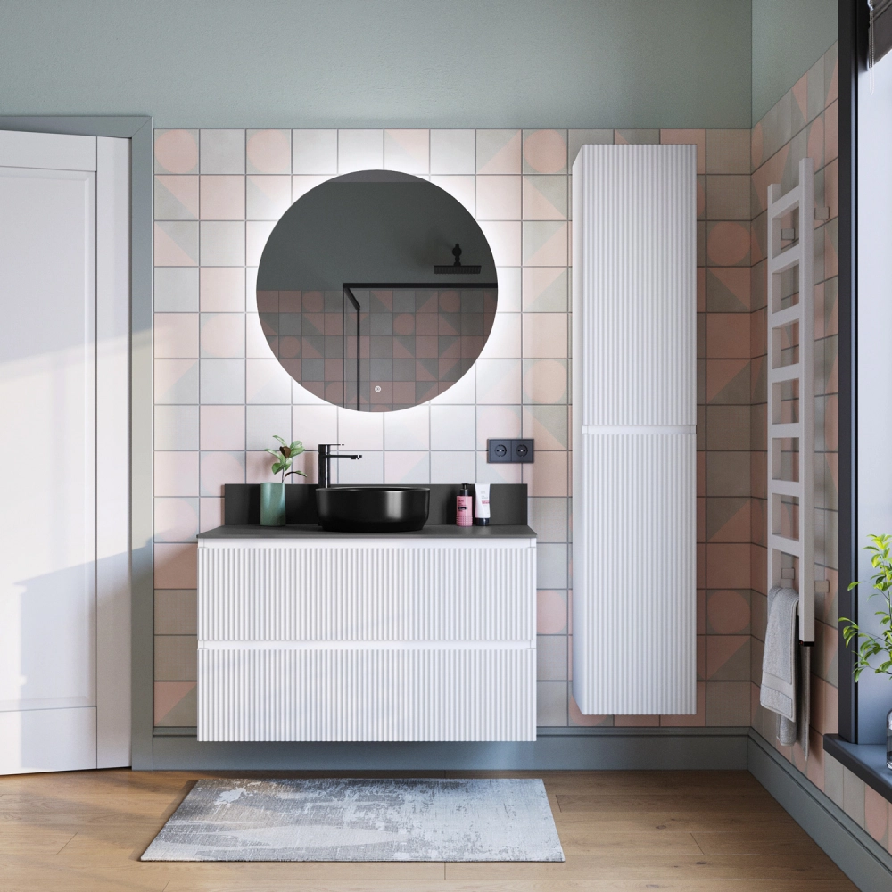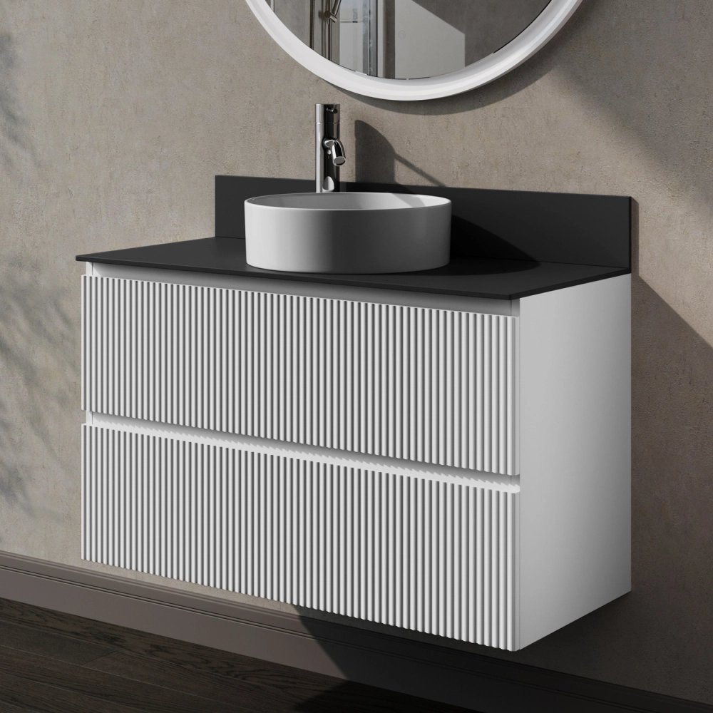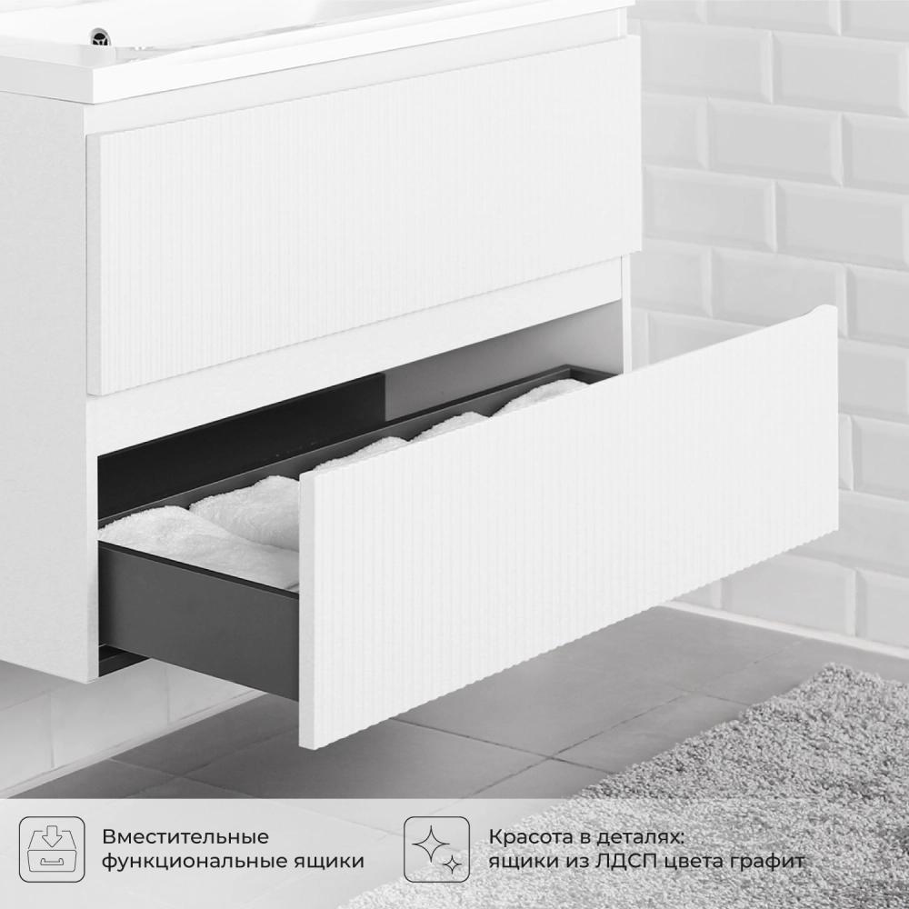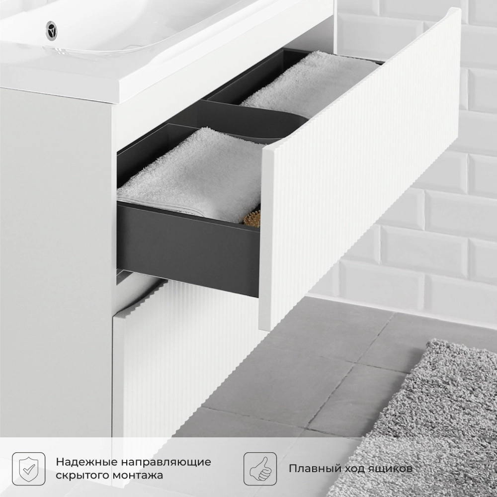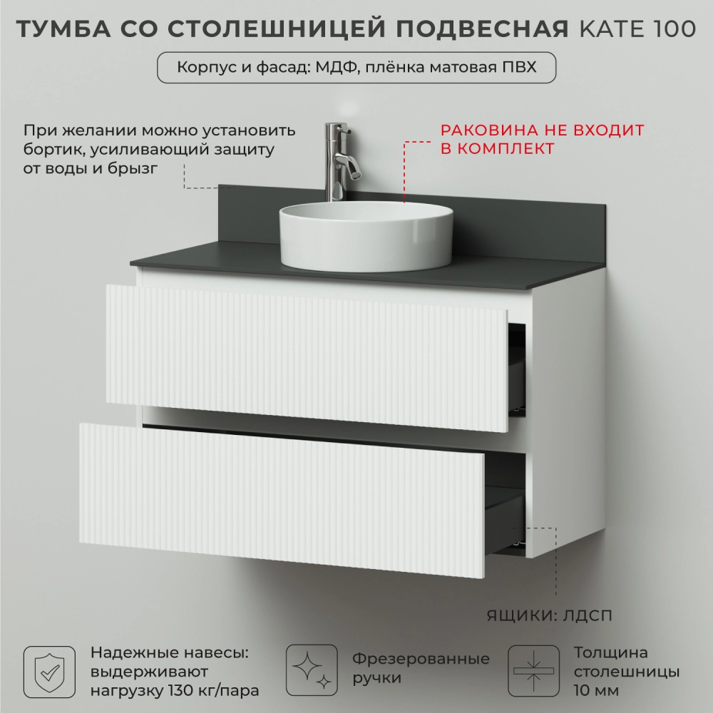 Подвесная тумба со столешницей из коллекции Kate станет настоящим украшением ванной комнаты в современном стиле. Навесной способ установки тумбы в ванную дает возможность не только визуально увеличить пространство, но и обеспечивает быстрый и удобный доступ для уборки. Размеры подвесной тумбы со столешницей 1002*445*610 - идеальный выбор для ванной комнаты или туалета. Тумба для ванны изготовлена из МДФ и покрыта ПВХ пленкой, поэтому выдерживает высокие эксплуатационные нагрузки. Качественная фурнитура с доводчиками обеспечивает легкое открывание и плавное закрывание ящиков. Вырез под сифон универсальный, для любого типа. Благодаря своей конструкции тумба обеспечивает удобный доступ к раковине и позволяет скрыть коммуникации. Тумба со столешницей в ванную оснащена двумя удобными ящиками для хранения, что позволяет разместить всё необходимое под рукой. Для точного выбора тумбы со столешницей в ванную комнату рекомендуем обратиться к схеме замеров, которая находится на фото в карточке товара, размеры изделия могут отличаться +/-1 см в связи со спецификой производства. Подвесная тумба со столешницей для ванной доставляется в предварительно собранном виде, надежно упакована.