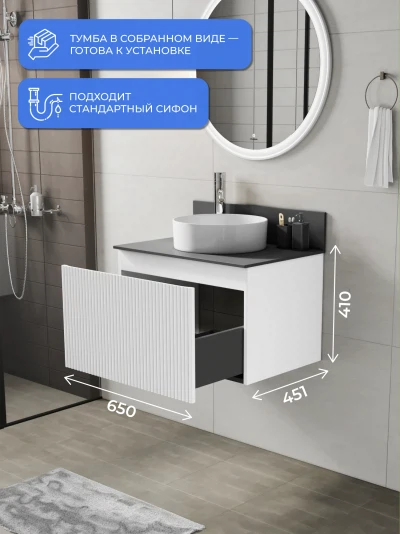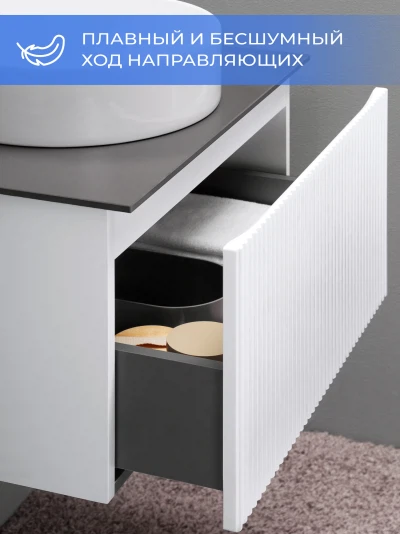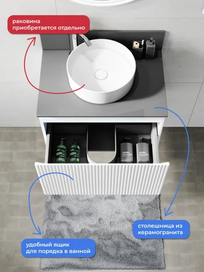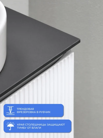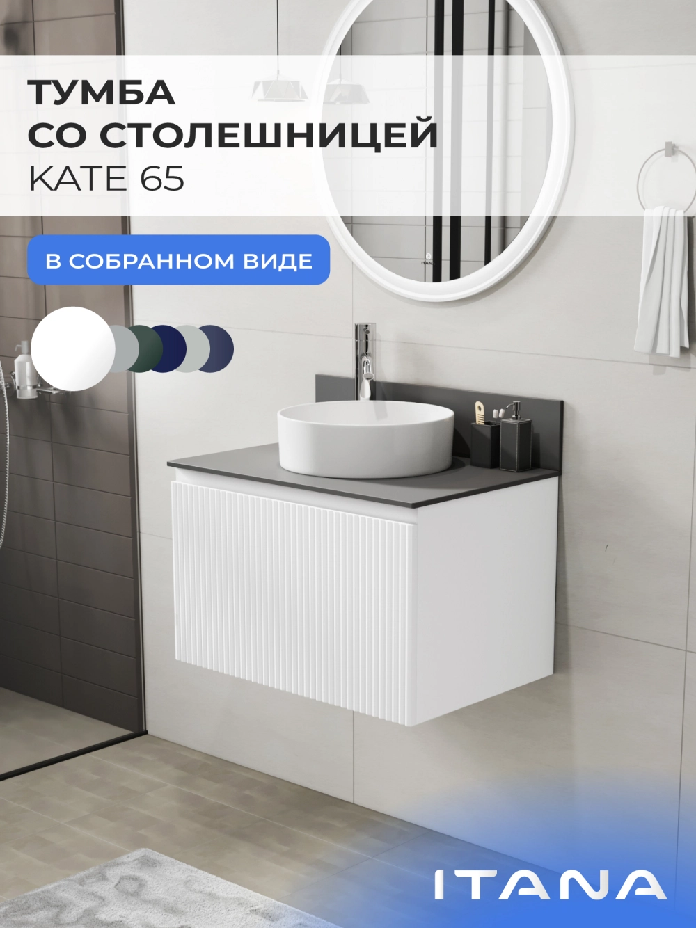 Подвесная тумба со столешницей Итана Kate 65 станет идеальным дополнением для вашей ванной комнаты, сочетая в себе стильный дизайн и функциональность. Коллекция Kate - воплотила в себе тренд на фактурные фасады. Идеальный "рубчик" - простое и стильное дизайнерское решение для декорирования фасадов - эта мебель бесспорно станет украшением современной ванной комнаты. Элегантная подвесная конструкция позволяет максимально эффективно использовать пространство, создавая ощущение легкости и визуальной свободы в интерьере. Благодаря компактным габаритам тумба идеально подходит даже для небольших ванных комнат, при этом предоставляя достаточно места для хранения необходимых принадлежностей. Тумба изготовлена из высококачественных материалов, гарантируя долговечность и надежность эксплуатации. Удобные фрезерованные ручки, качественная фурнитура с доводчиками, вместительность - мы продумали все, чтобы тумба под раковину была не просто красивой, но еще и функциональной, приятной в использовании. Ее конструкция позволяет легко поддерживать порядок в ванной, ведь все мелочи будут аккуратно убраны. Столешница выполнена из керамогранита, обладая устойчивостью к механическим повреждениям и влиянию химических средств. Стильный декор тумбы со столешницей добавляет изюминку в общий дизайн, вписываясь в современные и классические интерьеры. Подвесная тумба для ванной Итана Kate 65 — это также безопасность и удобство в уборке, так как свободное пространство под ней позволяет легко очистить пол. Безупречное сочетание столешницы с тумбой подчеркивает общий стиль вашей ванной комнаты, делая ее уютной и функциональной. Для точного выбора тумбочки со столешницей в ванную комнату рекомендуем обратиться к схеме замеров, которая находится на фото в карточке товара, размеры изделия могут отличаться +/-1 см в связи со спецификой производства. Тумба для ванной доставляется в предварительно собранном виде, надежно упакована.