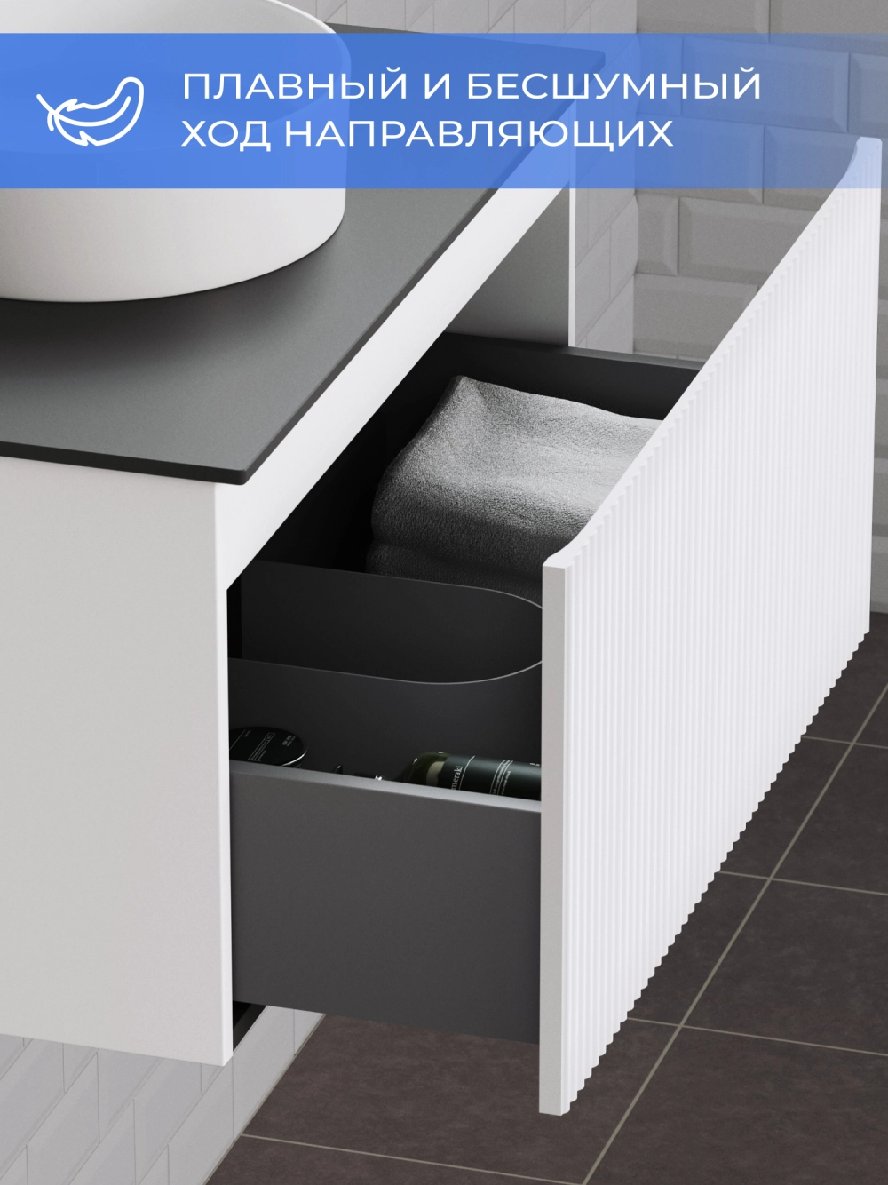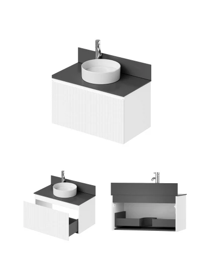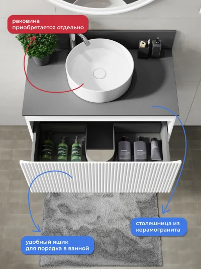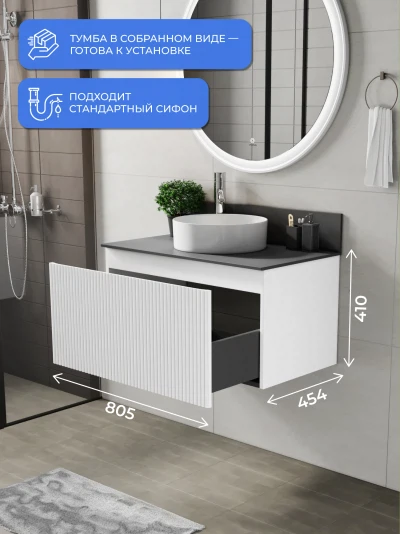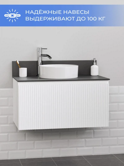 Подвесная тумба со столешницей Итана Kate 80 станет идеальным дополнением для вашей ванной комнаты, сочетая в себе стильный дизайн и функциональность. Коллекция Kate - воплотила в себе тренд на фактурные фасады. Идеальный "рубчик" - простое и стильное дизайнерское решение для декорирования фасадов - эта мебель бесспорно станет украшением современной ванной комнаты. Элегантная подвесная конструкция позволяет максимально эффективно использовать пространство, создавая ощущение легкости и визуальной свободы в интерьере. Благодаря компактным габаритам тумба идеально подходит даже для небольших ванных комнат, при этом предоставляя достаточно места для хранения необходимых принадлежностей. Тумба изготовлена из высококачественных материалов, гарантируя долговечность и надежность эксплуатации. Удобные фрезерованные ручки, качественная фурнитура с доводчиками, вместительность - мы продумали все, чтобы тумба под раковину была не просто красивой, но еще и функциональной, приятной в использовании. Ее конструкция позволяет легко поддерживать порядок в ванной, ведь все мелочи будут аккуратно убраны. Столешница выполнена из керамогранита, обладая устойчивостью к механическим повреждениям и влиянию химических средств. Стильный декор тумбы со столешницей добавляет изюминку в общий дизайн, вписываясь в современные и классические интерьеры. Подвесная тумба для ванной Итана Kate 80 — это также безопасность и удобство в уборке, так как свободное пространство под ней позволяет легко очистить пол. Безупречное сочетание столешницы с тумбой подчеркивает общий стиль вашей ванной комнаты, делая ее уютной и функциональной. Для точного выбора тумбочки со столешницей в ванную комнату рекомендуем обратиться к схеме замеров, которая находится на фото в карточке товара, размеры изделия могут отличаться +/-1 см в связи со спецификой производства. Тумба для ванной доставляется в предварительно собранном виде, надежно упакована.