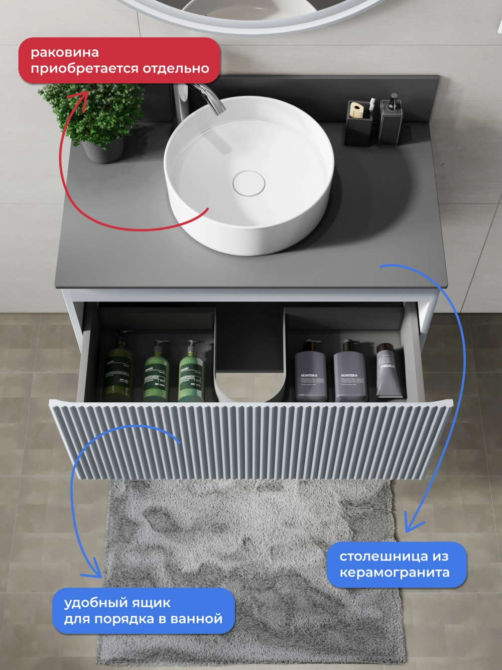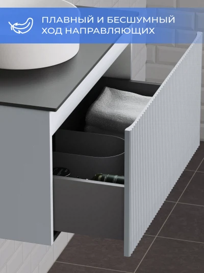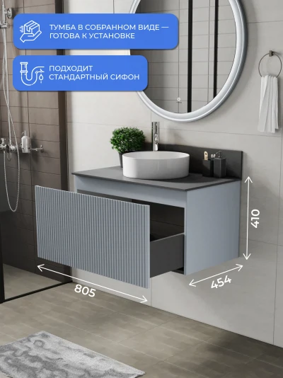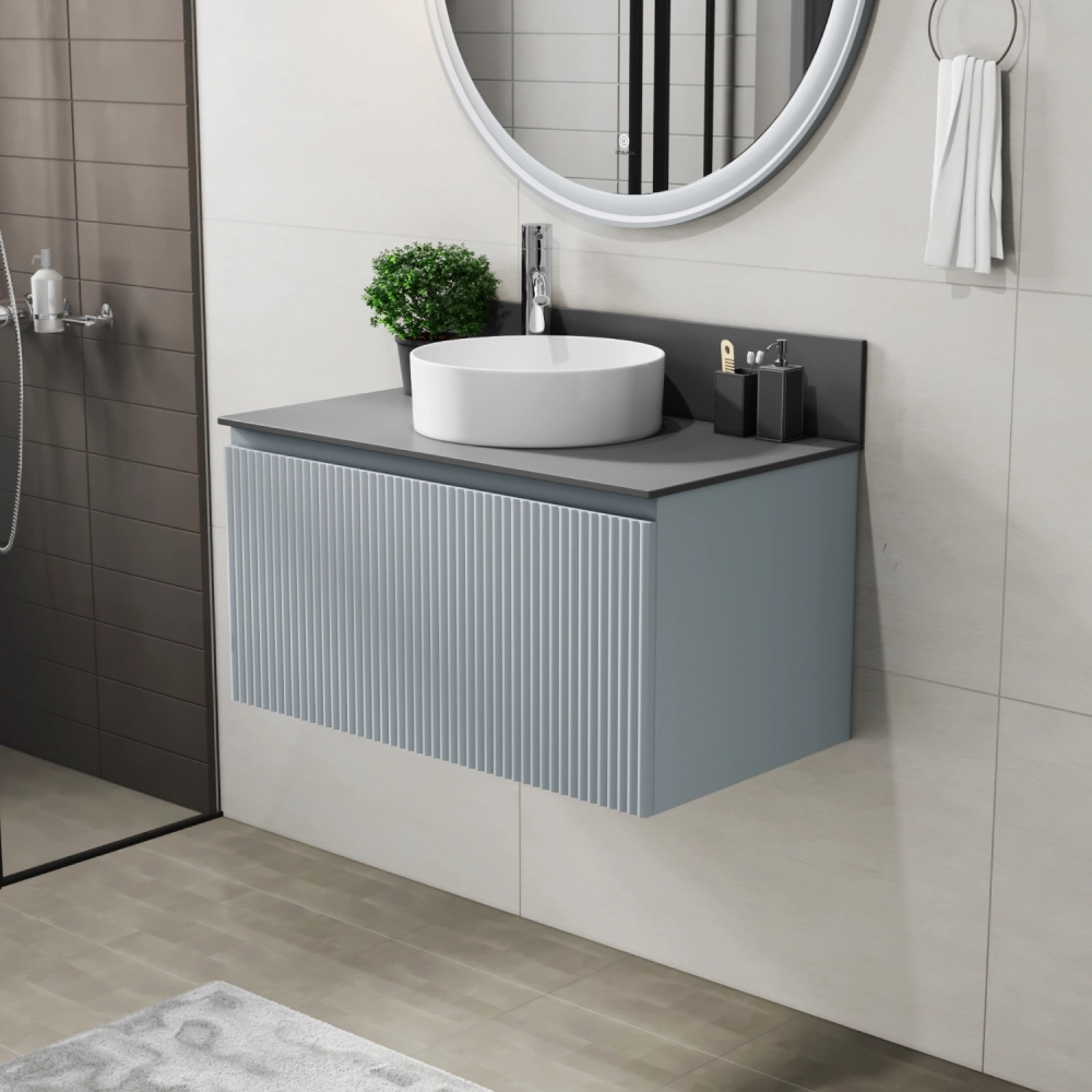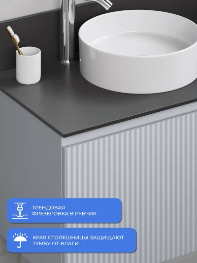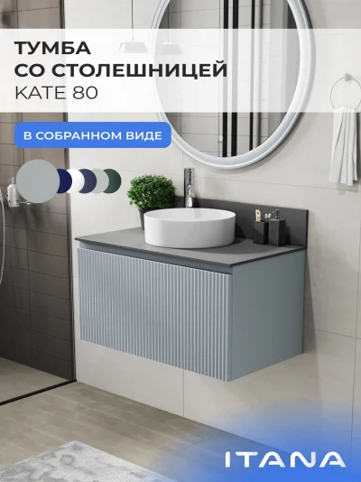 Подвесная тумба со столешницей Итана Kate 80 станет идеальным дополнением для вашей ванной комнаты, сочетая в себе стильный дизайн и функциональность. Коллекция Kate - воплотила в себе тренд на фактурные фасады. Идеальный "рубчик" - простое и стильное дизайнерское решение для декорирования фасадов - эта мебель бесспорно станет украшением современной ванной комнаты. Элегантная подвесная конструкция позволяет максимально эффективно использовать пространство, создавая ощущение легкости и визуальной свободы в интерьере. Благодаря компактным габаритам тумба идеально подходит даже для небольших ванных комнат, при этом предоставляя достаточно места для хранения необходимых принадлежностей. Тумба изготовлена из высококачественных материалов, гарантируя долговечность и надежность эксплуатации. Удобные фрезерованные ручки, качественная фурнитура с доводчиками, вместительность - мы продумали все, чтобы тумба под раковину была не просто красивой, но еще и функциональной, приятной в использовании. Ее конструкция позволяет легко поддерживать порядок в ванной, ведь все мелочи будут аккуратно убраны. Столешница выполнена из керамогранита, обладая устойчивостью к механическим повреждениям и влиянию химических средств. Стильный декор тумбы со столешницей добавляет изюминку в общий дизайн, вписываясь в современные и классические интерьеры. Подвесная тумба для ванной Итана Kate 80 — это также безопасность и удобство в уборке, так как свободное пространство под ней позволяет легко очистить пол. Безупречное сочетание столешницы с тумбой подчеркивает общий стиль вашей ванной комнаты, делая ее уютной и функциональной. Для точного выбора тумбочки со столешницей в ванную комнату рекомендуем обратиться к схеме замеров, которая находится на фото в карточке товара, размеры изделия могут отличаться +/-1 см в связи со спецификой производства. Тумба для ванной доставляется в предварительно собранном виде, надежно упакована.