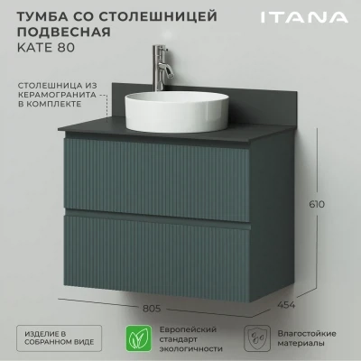 Тумба со столешницей подвесная Итана Kate 80 с выдвижными ящиками Велютто Авокадо