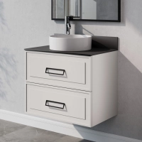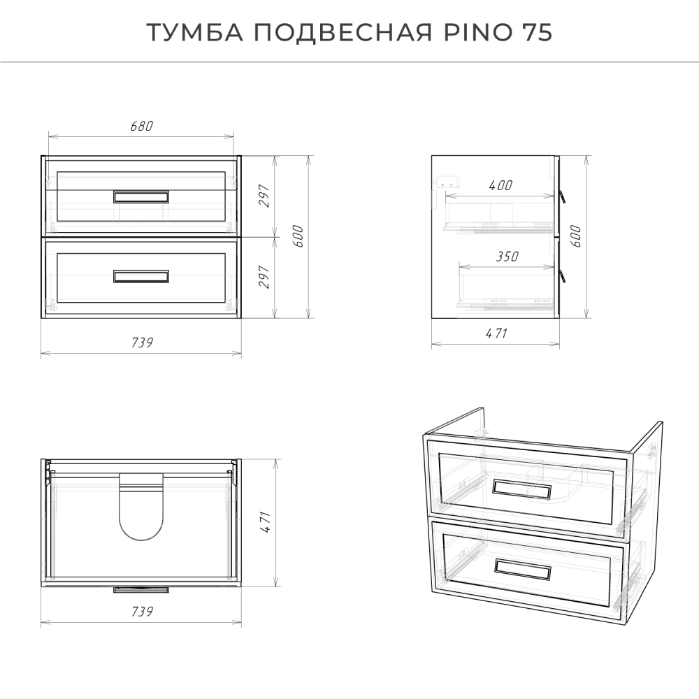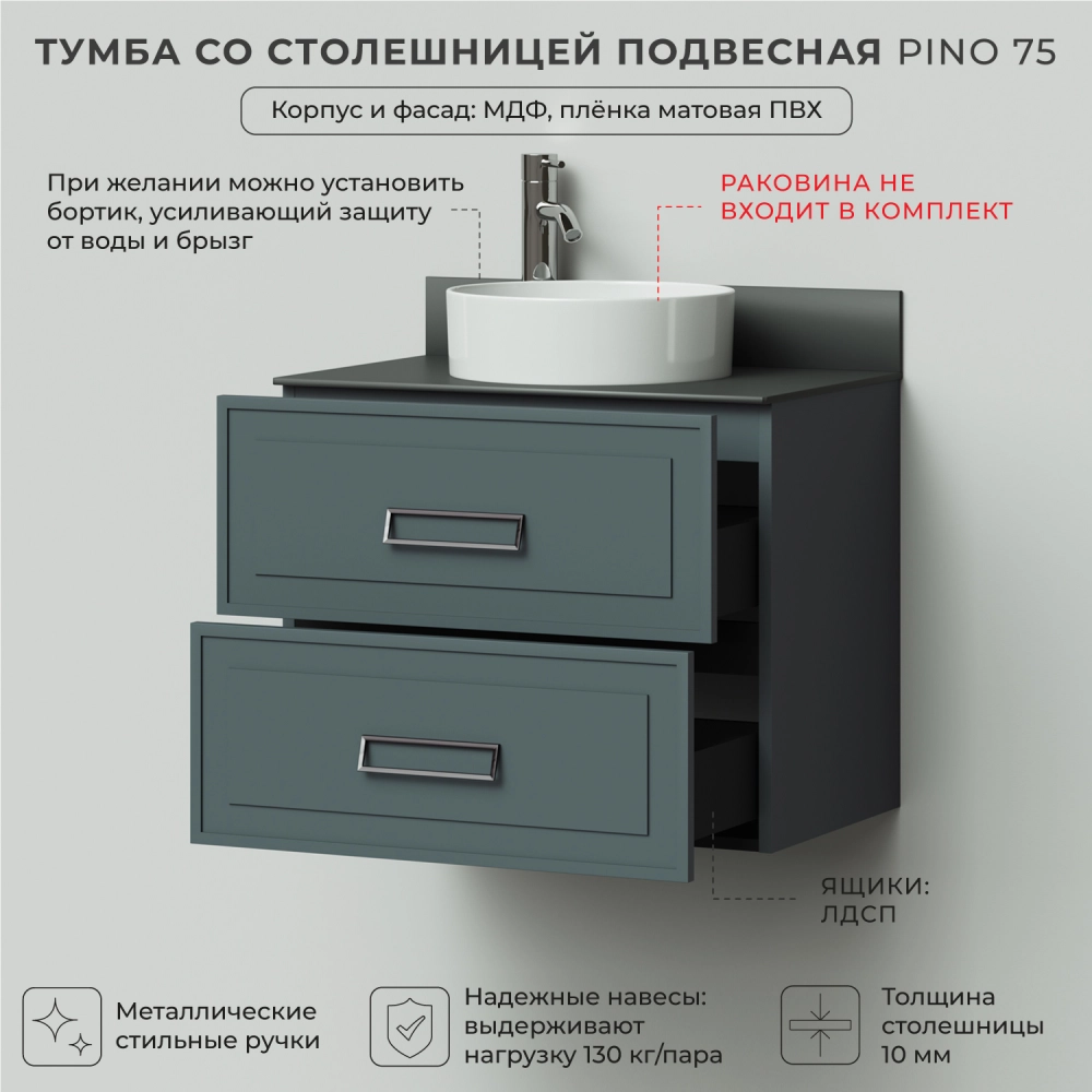Тумба со столешницей в ванную Итана из коллекции Pino. Размеры подвесной тумбы с раковиной 747х481х610 - идеальный выбор для ванной комнаты или туалета. Подвесная конструкция тумбы со столешницей позволяет сэкономить место на полу и визуально расширяет пространство. Тумба со столешницей в ванную подвесная выполнена из МФД и покрыта пленкой ПВХ, что гарантирует долговечность эксплуатации и износостойкость. Качественная фурнитура с доводчиками обеспечивает легкое открывание и плавное закрывание ящиков. Тумба со столешницей с двумя ящиками, где можно рационально распределить и разместить все необходимые вещи для ванной комнаты. Для точного выбора тумбы рекомендуем обратиться к схеме замеров, которая находится на фото в карточке товара. Размеры изделия могут отличаться +/-1 см в связи со спецификой производства. Подвесная тумба со столешницей приходит в надежной упаковке и в собранном виде.