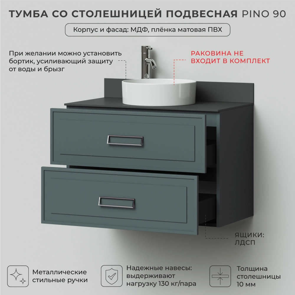 Тумба со столешницей в ванную Итана из коллекции Pino. Размеры подвесной тумбы со столешницей 910х488х610 - идеальный выбор для ванной комнаты или туалета. Подвесная конструкция тумбы со столешницей позволяет сэкономить место на полу и визуально расширяет пространство. Тумба со столешницей в ванную подвесная выполнена из МФД и покрыта пленкой ПВХ, что гарантирует долговечность эксплуатации и износостойкость. Качественная фурнитура с доводчиками обеспечивает легкое открывание и плавное закрывание ящиков. Тумба со столешницей с двумя ящиками, где можно рационально распределить и разместить все необходимые вещи для ванной комнаты. Для точного выбора тумбы рекомендуем обратиться к схеме замеров, которая находится на фото в карточке товара. Размеры изделия могут отличаться +/-1 см в связи со спецификой производства. Подвесная тумба со столешницей приходит в надежной упаковке и в собранном виде.