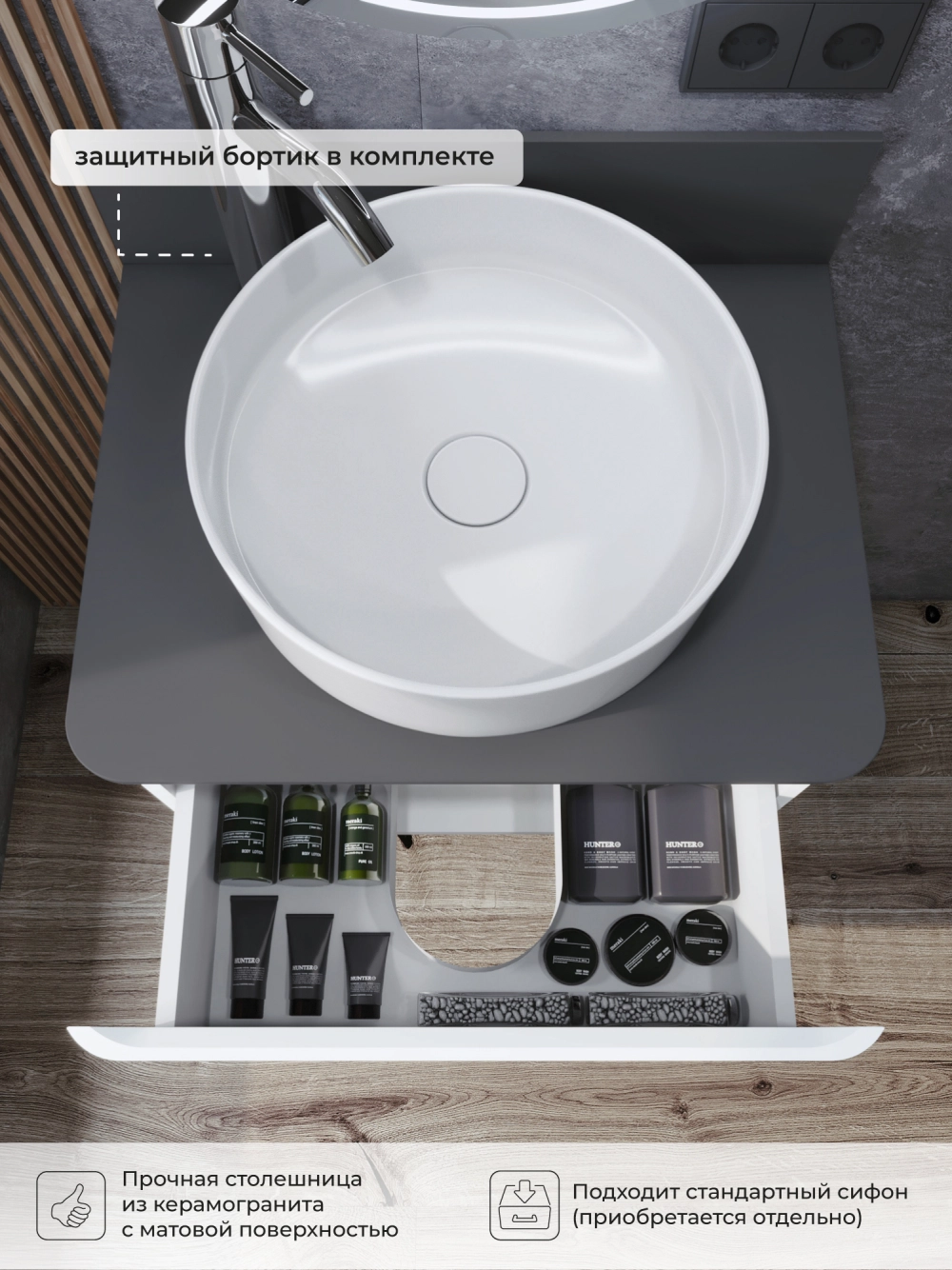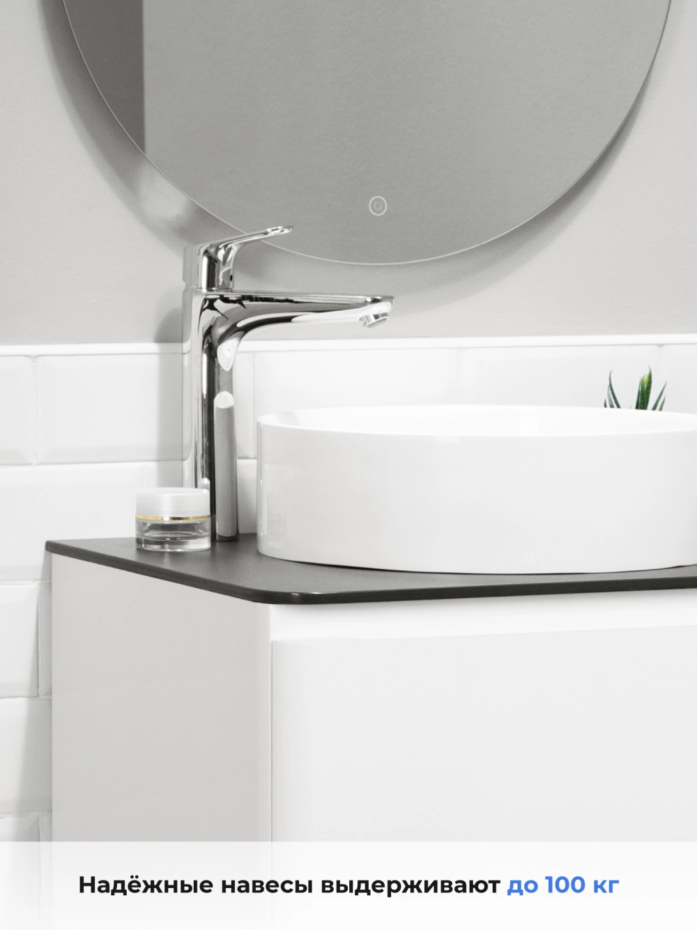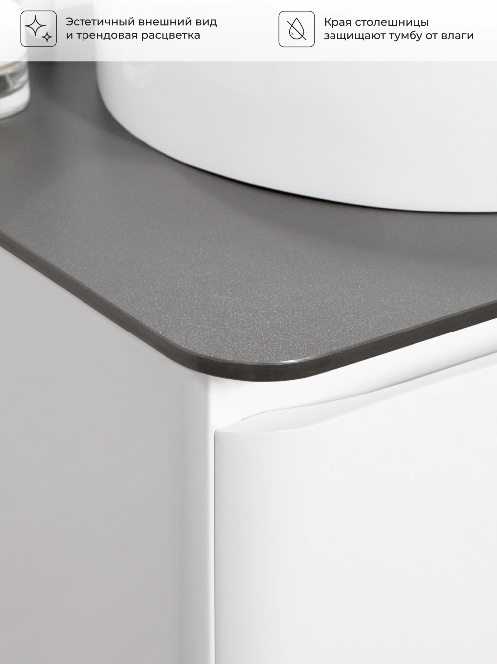 Невероятно органичная по дизайну коллекция Roberto великолепно смотрится в белом цвете. Эстетика изящества и минимализма - скругленные фасады, фрезерованные ручки. Подвесная тумба со столешницей в ванную комнату покрыта белой глянцевой эмалью. Качественная фурнитура с доводчиками обеспечивает легкое открывание и плавное закрывание ящика. Вырез под сифон универсальный, для любого типа. Благодаря своей конструкции тумба обеспечивает удобный доступ к раковине и позволяет скрыть коммуникации. Подвесной способ установки дает возможность не только визуально увеличить пространство, но и обеспечивает быстрый и удобный доступ для уборки. Тумба со столешницей в ванную оснащена удобным ящиком для хранения, что позволяет разместить всё необходимое под рукой. Изысканность, простота и гармоничность - все сошлось в этой прекрасной коллекции! Для точного выбора тумбочки со столешницей в ванную комнату рекомендуем обратиться к схеме замеров, которая находится в карточке товара, размеры изделия могут отличаться +/-1 см в связи со спецификой производства.
