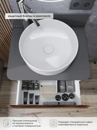 Подвесная тумба со столешницей из коллекции Roberto станет настоящим украшением вашей ванной комнаты. Тумба для ванны изготовлена из прочного МДФ, поэтому выдерживает высокие эксплуатационные нагрузки. Корпус и фасады тумбы для ванной покрыты матовой пленкой, что обеспечивает дополнительную защиту тумбы со столешницей от влаги и перепадов температуры. Качественная фурнитура с доводчиками обеспечивает легкое открывание и плавное закрывание ящика. Вырез под сифон универсальный, для любого типа. Благодаря своей конструкции тумба позволяет скрыть коммуникации. Тумба со столешницей в ванную оснащена удобным ящиком для хранения, что позволяет разместить всё необходимое под рукой. Дополнить комплект можно пеналом и зеркалом. Для точного выбора тумбочки со столешницей в ванную комнату рекомендуем обратиться к схеме замеров, которая находится на фото в карточке товара, размеры изделия могут отличаться +/-1 см в связи со спецификой производства. Тумба для ванной доставляется в предварительно собранном виде, надежно упакована.