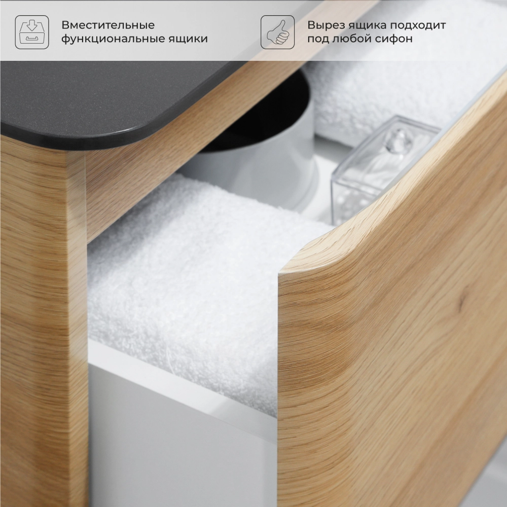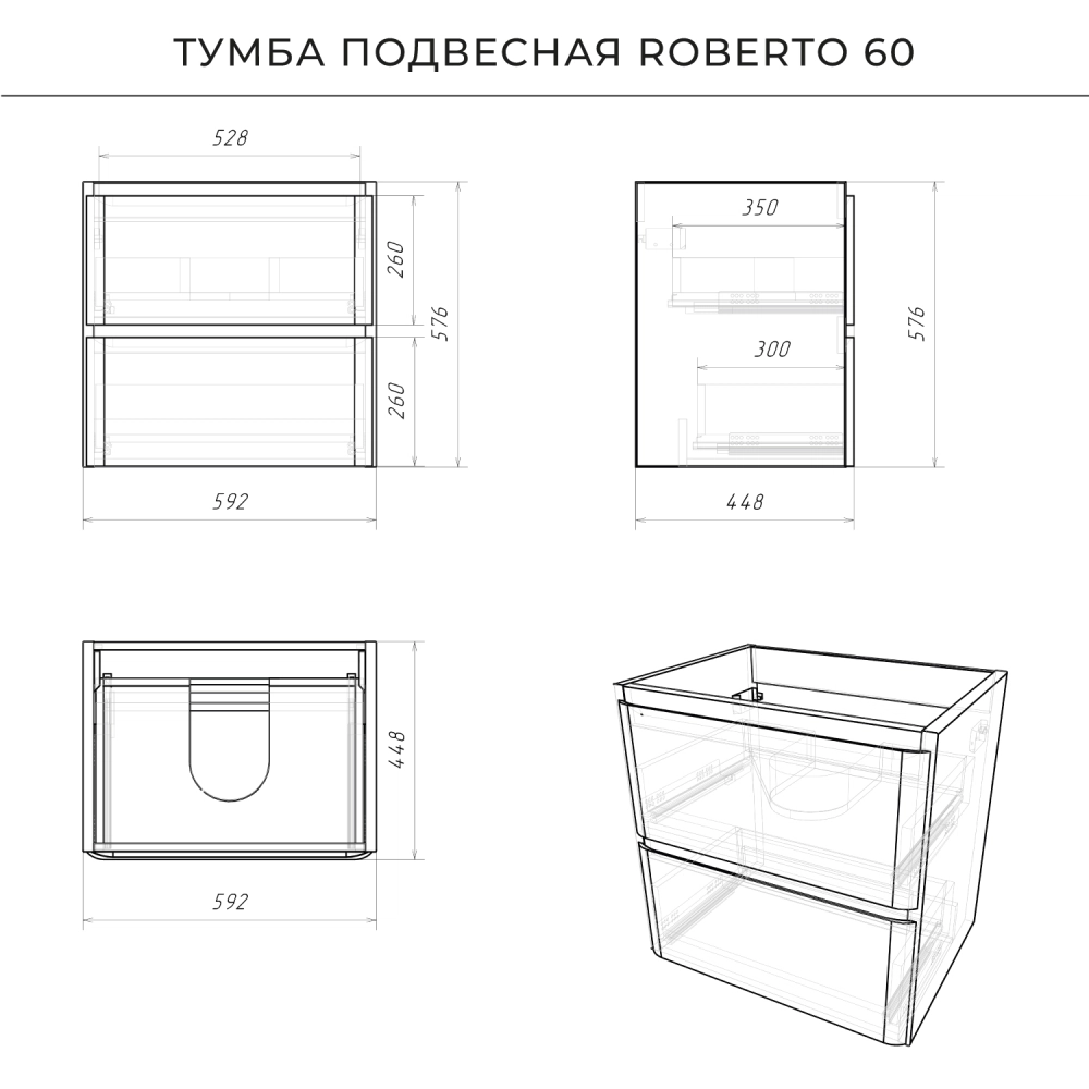 Подвесная тумба со столешницей в ванную из коллекции Roberto - это сочетание современной стилистики и богатого функционала. Тумба для ванны изготовлена из прочного МДФ, поэтому выдерживает высокие эксплуатационные нагрузки и обеспечивает дополнительную защиту тумбы со столешницей от влаги и перепадов температуры. Качественная фурнитура с доводчиками обеспечивает легкое открывание и плавное закрывание ящиков. Вырез под сифон универсальный, для любого типа. Благодаря своей конструкции тумба обеспечивает удобный доступ к раковине и позволяет скрыть коммуникации. Тумба со столешницей в ванную оснащена двумя удобными ящиками для хранения, что позволяет разместить всё необходимое под рукой. Ручки интегрированы в фасад, что исключает возможность случайного удара о фурнитуру. Для точного выбора тумбы со столешницей в ванную комнату рекомендуем обратиться к схеме замеров, которая находится на фото в карточке товара, размеры изделия могут отличаться +/-1 см в связи со спецификой производства. Тумба для ванной доставляется в предварительно собранном виде, надежно упакована.