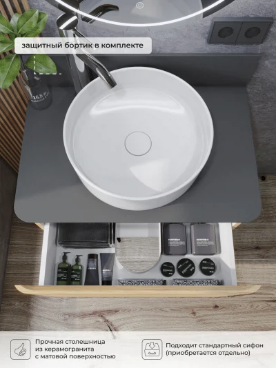 Подвесная тумба со столешницей из коллекции Roberto станет настоящим украшением вашей ванной комнаты. Тумба для ванны изготовлена из прочного МДФ, поэтому выдерживает высокие эксплуатационные нагрузки. Корпус и фасады тумбы для ванной покрыты матовой пленкой, что обеспечивает дополнительную защиту тумбы со столешницей от влаги и перепадов температуры. Качественная фурнитура с доводчиками обеспечивает легкое открывание и плавное закрывание ящика. Вырез под сифон универсальный, для любого типа. Благодаря своей конструкции тумба позволяет скрыть коммуникации. Тумба со столешницей в ванную оснащена удобным ящиком для хранения, что позволяет разместить всё необходимое под рукой. Дополнить комплект можно пеналом и зеркалом. Для точного выбора тумбочки со столешницей в ванную комнату рекомендуем обратиться к схеме замеров, которая находится на фото в карточке товара, размеры изделия могут отличаться +/-1 см в связи со спецификой производства. Тумба для ванной доставляется в предварительно собранном виде, надежно упакована.