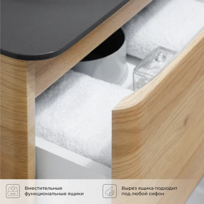 Подвесная тумба со столешницей в ванную из коллекции Roberto - это сочетание современной стилистики и богатого функционала. Тумба для ванны изготовлена из прочного МДФ, поэтому выдерживает высокие эксплуатационные нагрузки и обеспечивает дополнительную защиту тумбы со столешницей от влаги и перепадов температуры. Качественная фурнитура с доводчиками обеспечивает легкое открывание и плавное закрывание ящиков. Вырез под сифон универсальный, для любого типа. Благодаря своей конструкции тумба обеспечивает удобный доступ к раковине и позволяет скрыть коммуникации. Тумба со столешницей в ванную оснащена удобным ящиком для хранения, что позволяет разместить всё необходимое под рукой. Ручки интегрированы в фасад, что исключает возможность случайного удара о фурнитуру. Для точного выбора тумбы со столешницей в ванную комнату рекомендуем обратиться к схеме замеров, которая находится на фото в карточке товара, размеры изделия могут отличаться +/-1 см в связи со спецификой производства. Тумба для ванной доставляется в предварительно собранном виде, надежно упакована.