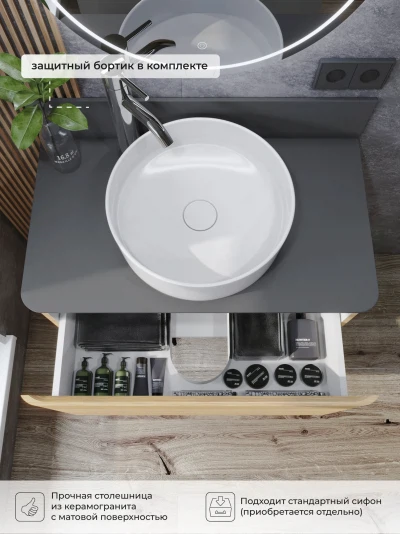 Подвесная тумба со столешницей из коллекции Roberto станет настоящим украшением вашей ванной комнаты. Тумба для ванны изготовлена из прочного МДФ, поэтому выдерживает высокие эксплуатационные нагрузки. Корпус и фасады тумбы для ванной покрыты матовой пленкой, что обеспечивает дополнительную защиту тумбы со столешницей от влаги и перепадов температуры. Качественная фурнитура с доводчиками обеспечивает легкое открывание и плавное закрывание ящика. Вырез под сифон универсальный, для любого типа. Благодаря своей конструкции тумба позволяет скрыть коммуникации. Тумба со столешницей в ванную оснащена удобным ящиком для хранения, что позволяет разместить всё необходимое под рукой. Дополнить комплект можно пеналом и зеркалом. Для точного выбора тумбочки со столешницей в ванную комнату рекомендуем обратиться к схеме замеров, которая находится на фото в карточке товара, размеры изделия могут отличаться +/-1 см в связи со спецификой производства. Тумба для ванной доставляется в предварительно собранном виде, надежно упакована.