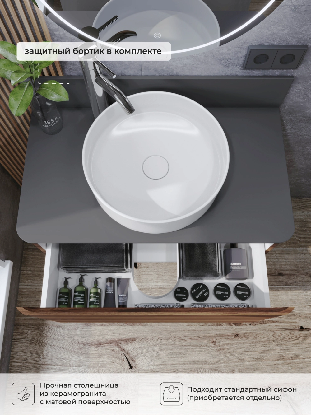 Подвесная тумба со столешницей из коллекции Roberto станет настоящим украшением вашей ванной комнаты. Тумба для ванны изготовлена из прочного МДФ, поэтому выдерживает высокие эксплуатационные нагрузки. Корпус и фасады тумбы для ванной покрыты матовой пленкой, что обеспечивает дополнительную защиту тумбы со столешницей от влаги и перепадов температуры. Качественная фурнитура с доводчиками обеспечивает легкое открывание и плавное закрывание ящика. Вырез под сифон универсальный, для любого типа. Благодаря своей конструкции тумба позволяет скрыть коммуникации. Тумба со столешницей в ванную оснащена удобным ящиком для хранения, что позволяет разместить всё необходимое под рукой. Дополнить комплект можно пеналом и зеркалом. Для точного выбора тумбочки со столешницей в ванную комнату рекомендуем обратиться к схеме замеров, которая находится на фото в карточке товара, размеры изделия могут отличаться +/-1 см в связи со спецификой производства. Тумба для ванной доставляется в предварительно собранном виде, надежно упакована.