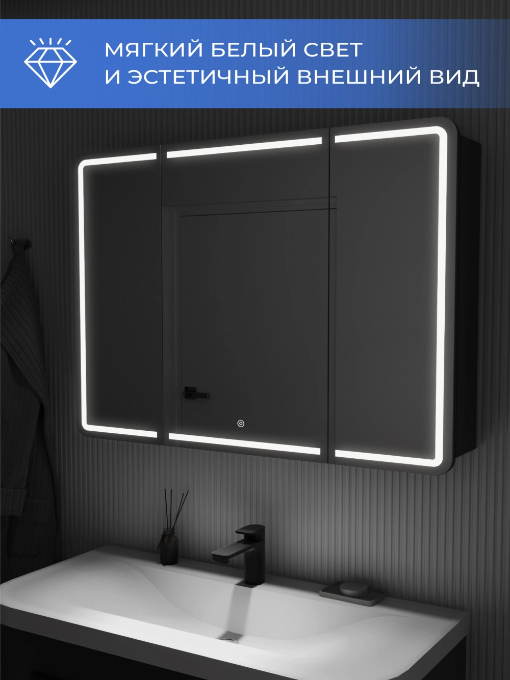 Зеркальный шкаф с подсветкой Итана Miro 100 – это идеальное решение для тех, кто ценит функциональность и стиль в ванной комнате. Этот зеркальный шкаф с подсветкой в ванную позволяет не только удобно хранить все необходимые мелочи, но и дополнительно освещает пространство, создавая уютную атмосферу. Зеркало с подсветкой размером 1000х150х790 мм легко впишется в интерьер любой ванной комнаты, делая её визуально более просторной и светлой. Темно-серый цвет корпуса придаёт изделию элегантный и современный вид, который гармонично сочетается с большинством современных дизайнов. Шкаф оснащён тремя дверками, что делает его особенно удобным для размещения рядом с раковиной и позволяет максимально эффективно использовать пространство. Встроенная подсветка не только обеспечивает дополнительное освещение для выполнения утренних и вечерних ритуалов, но также выгодно подчёркивает красоту интерьера. Этот зеркальный шкаф с подсветкой идеально подходит для тех, кто хочет добавить своей ванной комнате больше функционала и эстетики. Зеркало в ванную с подсветкой Итана Miro 100 изготовлено из высококачественных материалов. Кроме того, его легко чистить, что особенно важно для ванной комнаты. Простота монтажа позволяет быстро и без лишних усилий установить шкаф в любое удобное место. Если вы ищете стильное и практичное решение для ванной комнаты, зеркальный шкаф с подсветкой в ванную Итана Miro 100 станет отличным выбором. Этот зеркальный шкаф не только помогает поддерживать порядок, но и вносит в интерьер нотки современности и изысканности. Зеркало с подсветкой в ванную комнату – это незаменимый элемент для тех, кто стремится к современному и удобному оформлению своего пространства. Выбирая зеркальный шкаф с подсветкой Итана Miro 100, вы получаете надежное и качественное изделие, которое прослужит вам долгие годы.