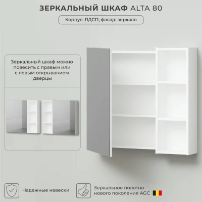 Зеркало-шкаф в ванную Alta 80 поможет создать комфортные условия в ванной комнате. Зеркало в ванную с размерами 800х160х750 мм. позволяют разместить шкаф в любом пространстве, делая его идеальным решением как для больших, так и небольших ванных комнат. Корпус и фасад изготовлены из ламинированного ДСП. Этот шкаф для ванной оснащен зеркалом, что делает его не только практичным, но и удобным для повседневного использования. Вместительные полки внутри и снаружи шкафа позволят хранить все необходимые аксессуары и косметические средства в порядке. Удобная система крепления позволяет быстро и надежно установить шкаф на стену. Для точного выбора шкафа с зеркалом в ванную комнату рекомендуем обратиться к схеме замеров, которая находится на фото в карточке товара, размеры изделия могут отличаться +/-1 см в связи со спецификой производства. Зеркальный шкаф в ванную доставляется в предварительно собранном виде, надежно упакован.