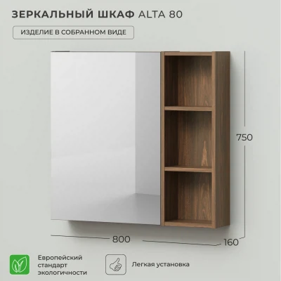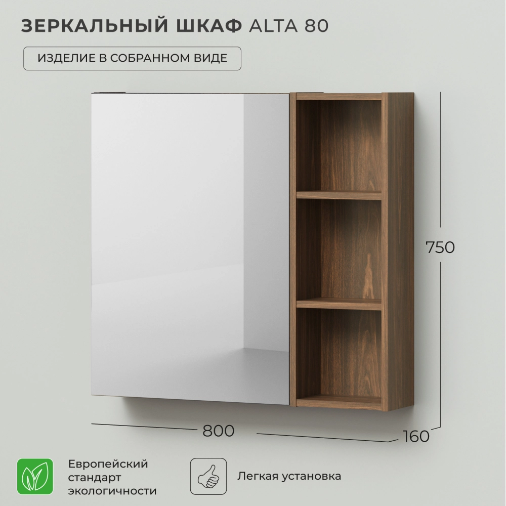 Зеркало-шкаф в ванную Alta 80 поможет создать комфортные условия в ванной комнате. Зеркало в ванную с размерами 800х160х750 мм. позволяют разместить шкаф в любом пространстве, делая его идеальным решением как для больших, так и небольших ванных комнат. Корпус и фасад изготовлены из ламинированного ДСП. Этот шкаф для ванной оснащен зеркалом, что делает его не только практичным, но и удобным для повседневного использования. Вместительные полки внутри и снаружи шкафа позволят хранить все необходимые аксессуары и косметические средства в порядке. Удобная система крепления позволяет быстро и надежно установить шкаф на стену. Для точного выбора шкафа с зеркалом в ванную комнату рекомендуем обратиться к схеме замеров, которая находится на фото в карточке товара, размеры изделия могут отличаться +/-1 см в связи со спецификой производства. Зеркальный шкаф в ванную доставляется в предварительно собранном виде, надежно упакован.