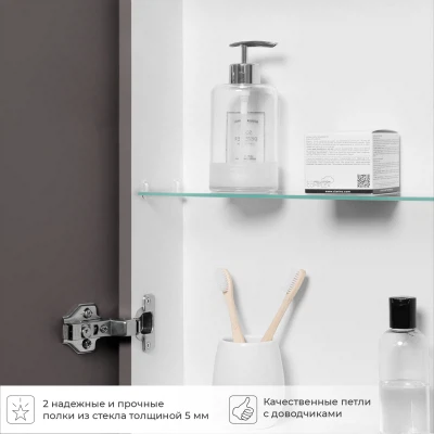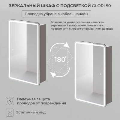 Зеркало-шкаф Итана Glori 50 с подсветкой соединяет в себе стильный дизайн и практичность использования. Размеры изделия составляют 500х150х790 мм, что обеспечивает достаточное пространство для хранения различных ванных принадлежностей. Особенностью данного зеркала является интегрированная подсветка, которая не только создает комфортные условия для нанесения макияжа или бритья, но и добавляет уютную атмосферу за счет мягкого и приятного света. Зеркальный шкаф в ванную оборудован одной дверцей, что обеспечивает удобный доступ ко всем полочкам внутри. Настенное крепление позволяет разместить его на удобной для вас высоте. Благодаря встроенной подсветке, вам не потребуется дополнительное освещение возле зеркала – это особенно актуально для тех, кто ценит удобство и экономию пространства. Для точного выбора шкафа с зеркалом в ванную комнату рекомендуем обратиться к схеме замеров, которая находится на фото в карточке товара, размеры изделия могут отличаться +/-1 см в связи со спецификой производства. Зеркальный шкаф с подсветкой доставляется в предварительно собранном виде, надежно упакован.
