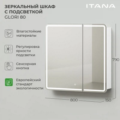 Зеркало-шкаф Итана Glori 80 с подсветкой соединяет в себе стильный дизайн и практичность использования. Размеры изделия составляют 800х150х790 мм, что обеспечивает достаточное пространство для хранения различных ванных принадлежностей. Особенностью данного зеркала является интегрированная подсветка, которая не только создает комфортные условия для нанесения макияжа или бритья, но и добавляет уютную атмосферу за счет мягкого и приятного света. Зеркальный шкаф в ванную оборудован одной дверцей, что обеспечивает удобный доступ ко всем полочкам внутри. Настенное крепление позволяет разместить его на удобной для вас высоте. Благодаря встроенной подсветке, вам не потребуется дополнительное освещение возле зеркала – это особенно актуально для тех, кто ценит удобство и экономию пространства. Для точного выбора шкафа с зеркалом в ванную комнату рекомендуем обратиться к схеме замеров, которая находится на фото в карточке товара, размеры изделия могут отличаться +/-1 см в связи со спецификой производства. Зеркальный шкаф с подсветкой доставляется в предварительно собранном виде, надежно упакован/