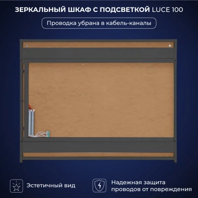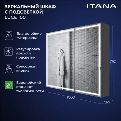 Зеркало-шкаф в ванную с подсветкой Luce 100 - это идеальное решение для вашей ванной комнаты. Этот элегантное и функциональное зеркало в ванную с размерами 1000х150х790 мм. легко впишется в интерьер любой ванной комнаты, делая её визуально более просторной и светлой. Зеркало оборудовано современной энергосберегающей подсветкой, которая обеспечивает яркий и равномерный свет, делая ваши утренние процедуры комфортными и удобными. Мягкое освещение идеально подходит для нанесения макияжа, бритья и других гигиенических процедур. Основное преимущество этого зеркального шкафа с подсветкой в ванную - это его продуманная конструкция. Вместительные полки внутри шкафа позволят хранить все необходимые аксессуары и косметические средства в порядке. Зеркальный шкаф Итана Luce 100 изготовлен из высококачественных материалов. Удобная система крепления позволяет быстро и надежно установить шкаф на стену. Для точного выбора шкафа с зеркалоом в ванную комнату рекомендуем обратиться к схеме замеров, которая находится на фото в карточке товара, размеры изделия могут отличаться +/-1 см в связи со спецификой производства. Зеркальный шкаф с подсветкой доставляется в предварительно собранном виде, надежно упакован.