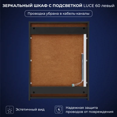 Зеркало-шкаф в ванную с подсветкой Luce 60 - это идеальное решение для вашей ванной комнаты. Этот элегантное и функциональное зеркало в ванную с размерами 600х150х790 мм. легко впишется в интерьер любой ванной комнаты, делая её визуально более просторной и светлой. Зеркало оборудовано современной энергосберегающей подсветкой, которая обеспечивает яркий и равномерный свет, делая ваши утренние процедуры комфортными и удобными. Мягкое освещение идеально подходит для нанесения макияжа, бритья и других гигиенических процедур. Основное преимущество этого зеркального шкафа с подсветкой в ванную - это его продуманная конструкция. Левосторонее открывание обеспечивает удобный доступ ко всем необходимым вещам, а вместительные полки внутри шкафа позволят хранить все необходимые аксессуары и косметические средства в порядке. Зеркальный шкаф Итана Luce 60 изготовлен из высококачественных материалов. Удобная система крепления позволяет быстро и надежно установить шкаф на стену. Для точного выбора шкафа с зеркалоом в ванную комнату рекомендуем обратиться к схеме замеров, которая находится на фото в карточке товара, размеры изделия могут отличаться +/-1 см в связи со спецификой производства. Зеркальный шкаф с подсветкой доставляется в предварительно собранном виде, надежно упакован.
