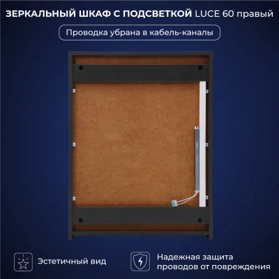 Зеркало-шкаф в ванную с подсветкой Luce 60 - это идеальное решение для вашей ванной комнаты. Этот элегантное и функциональное зеркало в ванную с размерами 600х150х790 мм. легко впишется в интерьер любой ванной комнаты, делая её визуально более просторной и светлой. Зеркало оборудовано современной энергосберегающей подсветкой, которая обеспечивает яркий и равномерный свет, делая ваши утренние процедуры комфортными и удобными. Мягкое освещение идеально подходит для нанесения макияжа, бритья и других гигиенических процедур. Основное преимущество этого зеркального шкафа с подсветкой в ванную - это его продуманная конструкция. Правосторонее открывание обеспечивает удобный доступ ко всем необходимым вещам, а вместительные полки внутри шкафа позволят хранить все необходимые аксессуары и косметические средства в порядке. Зеркальный шкаф Итана Luce 60 изготовлен из высококачественных материалов. Удобная система крепления позволяет быстро и надежно установить шкаф на стену. Для точного выбора шкафа с зеркалоом в ванную комнату рекомендуем обратиться к схеме замеров, которая находится на фото в карточке товара, размеры изделия могут отличаться +/-1 см в связи со спецификой производства. Зеркальный шкаф с подсветкой доставляется в предварительно собранном виде, надежно упакован.