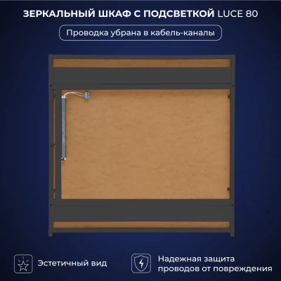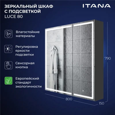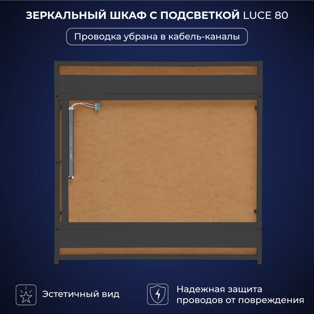 Зеркало-шкаф в ванную с подсветкой Luce 80 - это идеальное решение для вашей ванной комнаты. Этот элегантное и функциональное зеркало в ванную с размерами 800х150х790 мм. легко впишется в интерьер любой ванной комнаты, делая её визуально более просторной и светлой. Зеркало оборудовано современной энергосберегающей подсветкой, которая обеспечивает яркий и равномерный свет, делая ваши утренние процедуры комфортными и удобными. Мягкое освещение идеально подходит для нанесения макияжа, бритья и других гигиенических процедур. Основное преимущество этого зеркального шкафа с подсветкой в ванную - это его продуманная конструкция. Вместительные полки внутри шкафа позволят хранить все необходимые аксессуары и косметические средства в порядке. Зеркальный шкаф Итана Luce 80 изготовлен из высококачественных материалов. Удобная система крепления позволяет быстро и надежно установить шкаф на стену. Для точного выбора шкафа с зеркалоом в ванную комнату рекомендуем обратиться к схеме замеров, которая находится на фото в карточке товара, размеры изделия могут отличаться +/-1 см в связи со спецификой производства. Зеркальный шкаф с подсветкой доставляется в предварительно собранном виде, надежно упакован.