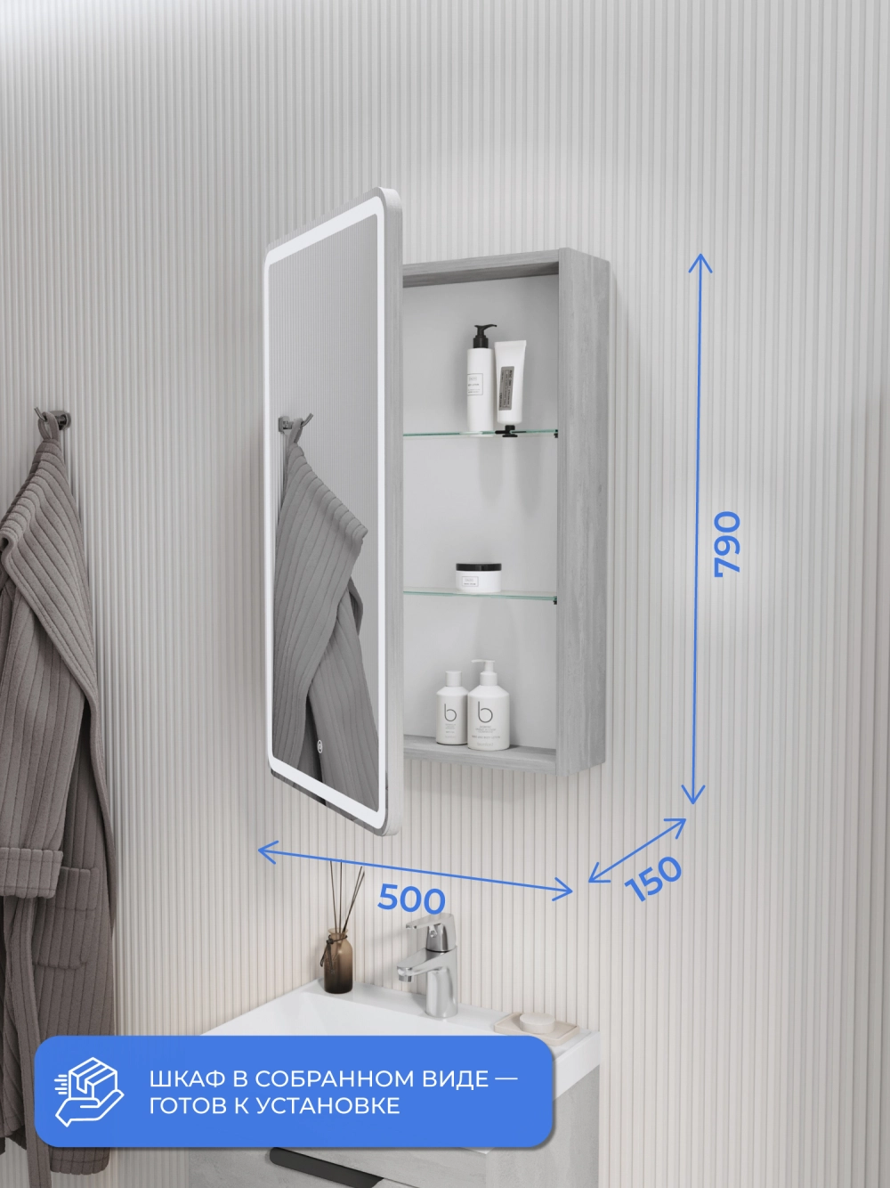 Зеркальный шкаф с подсветкой Итана Miro 50 – это идеальное решение для тех, кто ценит функциональность и стиль в ванной комнате. Этот зеркальный шкаф с подсветкой в ванную позволяет не только удобно хранить все необходимые мелочи, но и дополнительно освещает пространство, создавая уютную атмосферу. Зеркало с подсветкой размером 500х150х790 мм легко впишется в интерьер любой ванной комнаты, делая её визуально более просторной и светлой. Шкаф оснащён левосторонним открытием дверцы, что делает его особенно удобным для размещения рядом с раковиной и позволяет максимально эффективно использовать пространство. Встроенная подсветка не только обеспечивает дополнительное освещение для выполнения утренних и вечерних ритуалов, но также выгодно подчёркивает красоту интерьера. Этот зеркальный шкаф с подсветкой идеально подходит для тех, кто хочет добавить своей ванной комнате больше функционала и эстетики. Зеркало в ванную с подсветкой Итана Miro 50 изготовлено из высококачественных материалов. Кроме того, его легко чистить, что особенно важно для ванной комнаты. Простота монтажа позволяет быстро и без лишних усилий установить шкаф в любое удобное место. Если вы ищете стильное и практичное решение для ванной комнаты, зеркальный шкаф с подсветкой в ванную Итана Miro 50 станет отличным выбором. Этот зеркальный шкаф не только помогает поддерживать порядок, но и вносит в интерьер нотки современности и изысканности. Зеркало с подсветкой в ванную комнату – это незаменимый элемент для тех, кто стремится к современному и удобному оформлению своего пространства. Выбирая зеркальный шкаф с подсветкой Итана Miro 50, вы получаете надежное и качественное изделие, которое прослужит вам долгие годы.