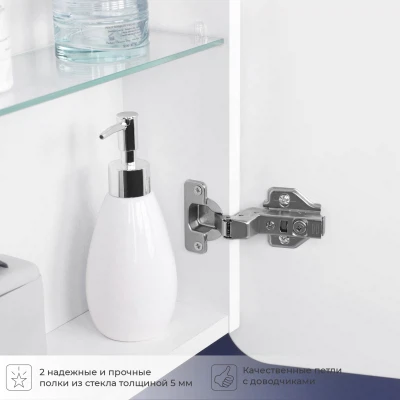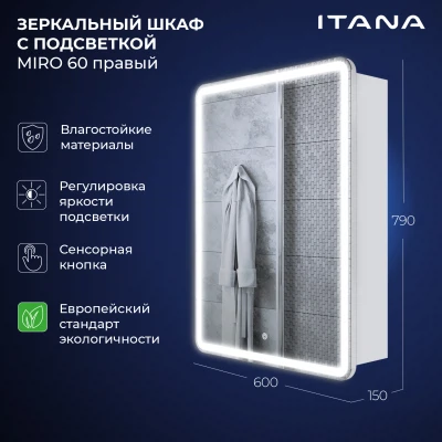 Зеркало-шкаф в ванную с подсветкой Miro 60 - это идеальное решение для вашей ванной комнаты. Этот элегантное и функциональное зеркало в ваннуюс размерами 600х150х790 мм. Зеркало оборудовано современной энергосберегающей подсветкой, которая обеспечивает яркий и равномерный свет, делая ваши утренние процедуры комфортными и удобными. Мягкое освещение идеально подходит для нанесения макияжа, бритья и других гигиенических процедур. Основное преимущество этого зеркального шкафа с подсветкой в ванную - это его продуманная конструкция. Правостороннее открывание обеспечивает удобный доступ ко всем необходимым вещам, а вместительные полки внутри шкафа позволят хранить все необходимые аксессуары и косметические средства в порядке. Зеркальный шкаф Итана Miro 60 изготовлен из высококачественных материалов. Удобная система крепления позволяет быстро и надежно установить шкаф на стену. Для точного выбора шкафа с зеркалом в ванную комнату рекомендуем обратиться к схеме замеров, которая находится на фото в карточке товара, размеры изделия могут отличаться +/-1 см в связи со спецификой производства. Зеркальный шкаф с подсветкой доставляется в предварительно собранном виде, надежно упакован.