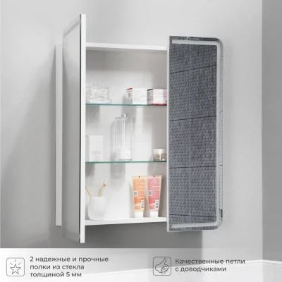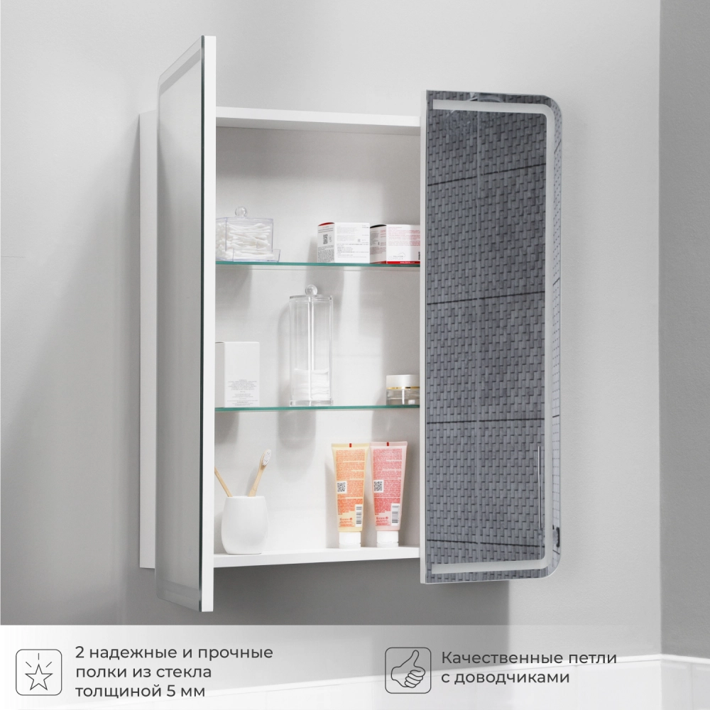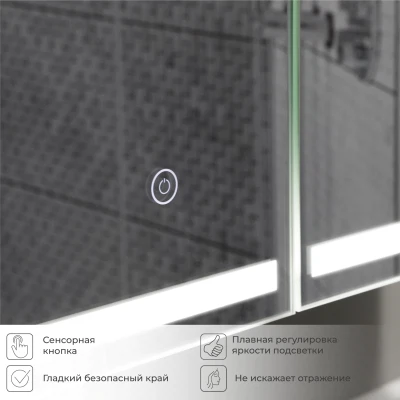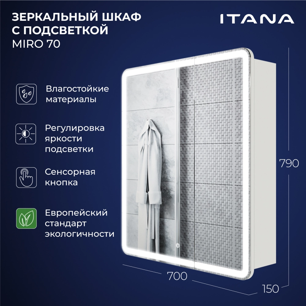 Зеркало-шкаф в ванную с подсветкой Miro 70 - это идеальное решение для вашей ванной комнаты. Этот элегантное и функциональное зеркало в ваннуюс размерами 700х150х790 мм. Зеркало оборудовано современной энергосберегающей подсветкой, которая обеспечивает яркий и равномерный свет, делая ваши утренние процедуры комфортными и удобными. Мягкое освещение идеально подходит для нанесения макияжа, бритья и других гигиенических процедур. Основное преимущество этого зеркального шкафа с подсветкой в ванную - это его продуманная конструкция. Вместительные полки внутри шкафа позволят хранить все необходимые аксессуары и косметические средства в порядке. Зеркальный шкаф Итана Miro 70 изготовлен из высококачественных материалов. Удобная система крепления позволяет быстро и надежно установить шкаф на стену. Для точного выбора шкафа с зеркалом в ванную комнату рекомендуем обратиться к схеме замеров, которая находится на фото в карточке товара, размеры изделия могут отличаться +/-1 см в связи со спецификой производства. Зеркальный шкаф с подсветкой доставляется в предварительно собранном виде, надежно упакован.