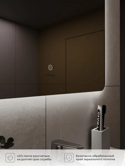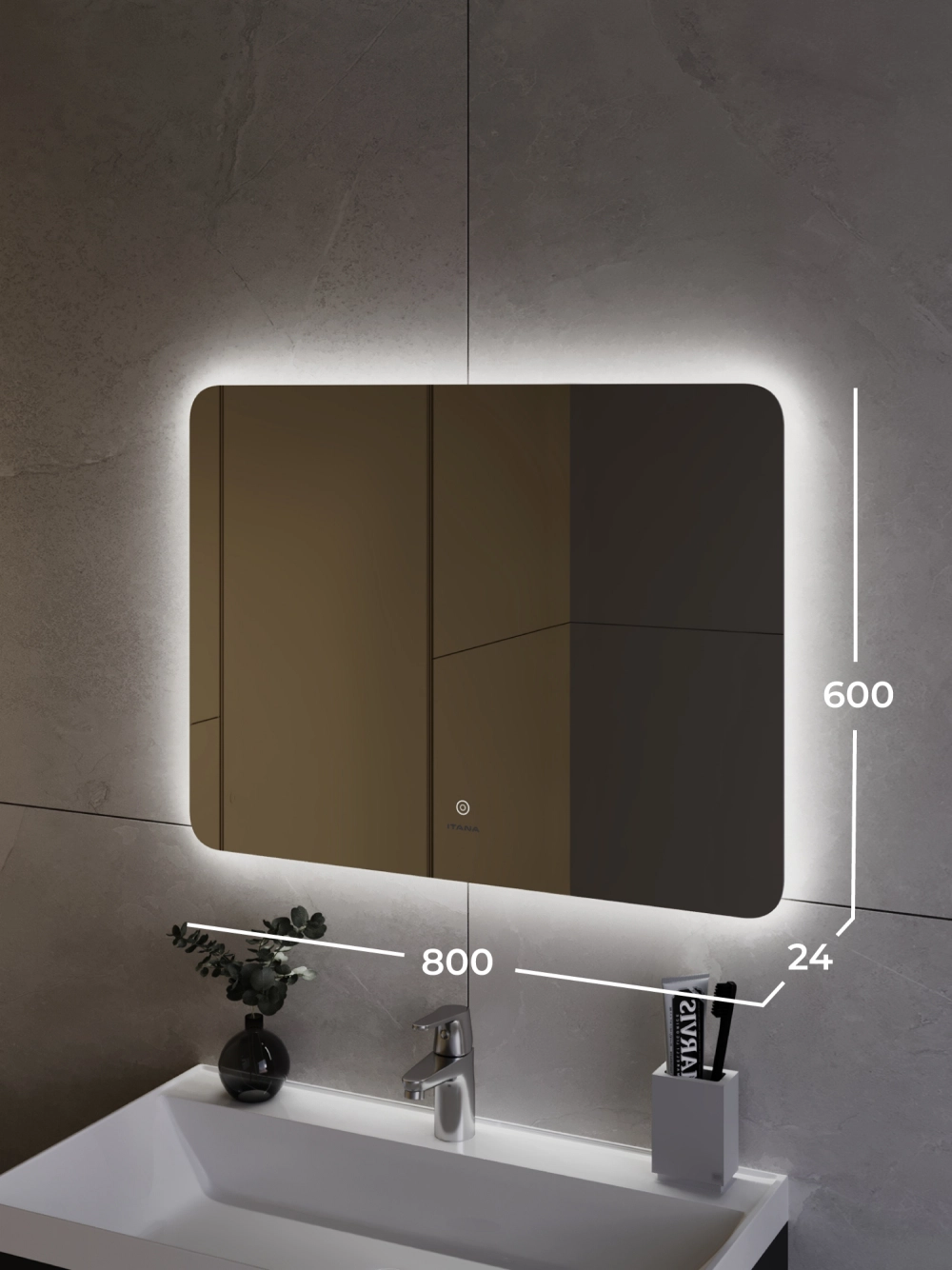 Зеркало с подсветкой Итана Oreol изготовлено из зеркального полотна толщиной 4 мм. Край зеркала в ванную обработан евро-кромкой. Настенное зеркало в ванную - современная и лаконичная по дизайну модель с удобным сенсорным управлением подсветки. При изготовлении используется светодиодная лента с плотностью диодов 120 шт./м и мощностью 9,6 Вт/м, цветовая температура 6000К (холодный свет) создающая мягкое и равномерное свечение по периметру зеркала. Подсветка рассчитана на 25 000 часов работы в непрерывном режиме. Зеркало с подсветкой может использоваться в помещениях с повышенной влажностью воздуха. В комплекте предусмотрен настенный крепеж. Для точного выбора зеркала с подсветкой в ванную комнату рекомендуем обратиться к схеме замеров, которая находится на фото в карточке товара, размеры изделия могут отличаться +/-1 см в связи со спецификой производства. Настенное зеркало с подственной для ванной доставляется в предварительно собранном виде, надежно упаковано.