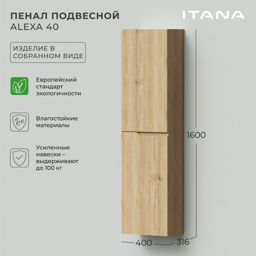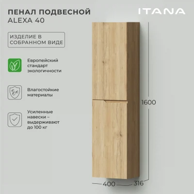 Шкаф пенал в ванную из коллекции Alexa 40 - это сочетание природного декора. Шкаф-пенал поможет создать комфортные условия в ванной комнате. Благодаря его компактным размерам 400х316х1600 и настенному крепежу он занимает немного места и надежно закрепляется. Дверь шкафа для ванной с левосторонним открыванием. Пенал в ванную изготовлен из МДФ и покрыт ПВХ пленкой, что обеспечивает ему привлекательный внешний вид, а также износостойкость и долговечность. Качественная фурнитура с доводчиками обеспечивает легкое открывание и плавное закрывание дверок. Внутри у пенала полки, где можно рационально распределить и разместить все необходимые вещи для ванной комнаты. Полки пенала легко переставить, возможно регулировать расстояние их между собой. Для точного выбора пенала в ванную комнату рекомендуем обратиться к схеме замеров, которая находится на фото в карточке товара. Размеры изделия могут отличаться +/-1 см в связи со спецификой производства. Дополнить комплект можно тумбой с раковиной и зеркалом из коллекции Alexa. Изделия коллекции качественные, функциональные и органически впишутся в популярные и современные интерьерные решения для ванных комнат. Шкаф пенал для ванной комнаты доставляется в предварительно собранном виде, надежно упакован.