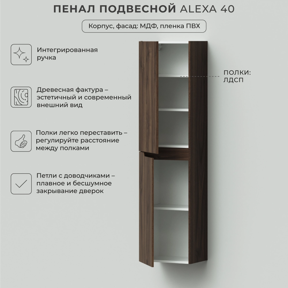 Шкаф пенал в ванную из коллекции Alexa 40 - это сочетание природного декора. Шкаф-пенал поможет создать комфортные условия в ванной комнате. Благодаря его компактным размерам 400х316х1600 и настенному крепежу он занимает немного места и надежно закрепляется. Дверь шкафа для ванной с левосторонним открыванием. Пенал в ванную изготовлен из МДФ и покрыт ПВХ пленкой, что обеспечивает ему привлекательный внешний вид, а также износостойкость и долговечность. Качественная фурнитура с доводчиками обеспечивает легкое открывание и плавное закрывание дверок. Внутри у пенала полки, где можно рационально распределить и разместить все необходимые вещи для ванной комнаты. Полки пенала легко переставить, возможно регулировать расстояние их между собой. Для точного выбора пенала в ванную комнату рекомендуем обратиться к схеме замеров, которая находится на фото в карточке товара. Размеры изделия могут отличаться +/-1 см в связи со спецификой производства. Дополнить комплект можно тумбой с раковиной и зеркалом из коллекции Alexa. Изделия коллекции качественные, функциональные и органически впишутся в популярные и современные интерьерные решения для ванных комнат. Шкаф пенал для ванной комнаты доставляется в предварительно собранном виде, надежно упакован.