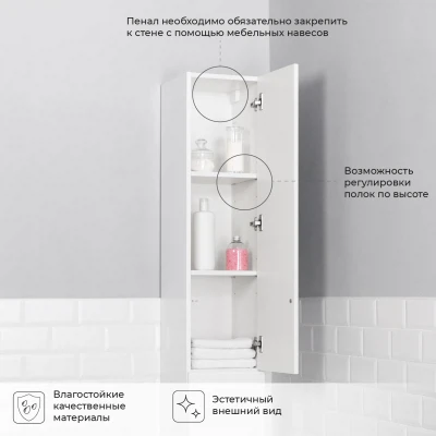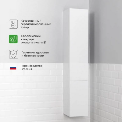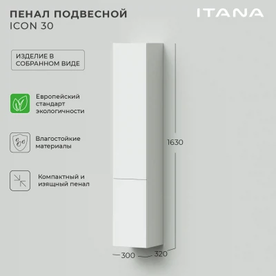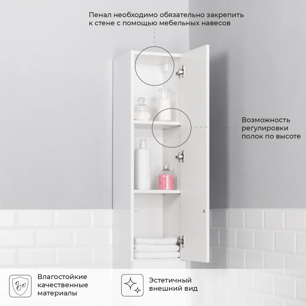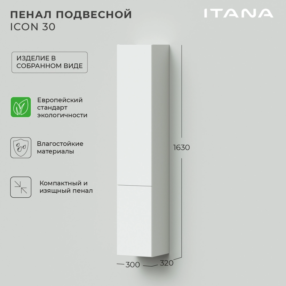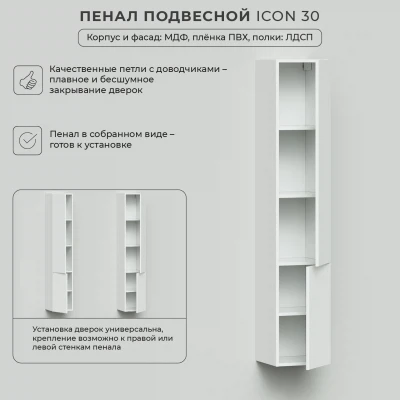 Пенал в ванную из коллекции Icon 30 - это сочетание природного декора. Шкаф-пенал поможет создать комфортные условия в ванной комнате. Благодаря его компактным размерам 300х320х1630 и настенному крепежу он занимает немного места и надежно закрепляется. Дверь шкафа универсальна, возможно установить на любую сторону, как правое, так и левое открывание. Подвесной пенал в ванную изготовлен из влагозащищенного МДФ, корпус и фасады покрыты высокоглянцевой ПВХ-пленкой, что обеспечивает ему привлекательный внешний вид, а также износостойкость и долговечность. Система push-to-open позволяет открывать распашную дверцу простым нажатием на фасад. Главное преимущество системы: отсутствие ручек на фасадах. Внутри шкафа полки, где можно рационально распределить и разместить все необходимые вещи для ванной комнаты. Полки пенала легко переставить, возможно регулировать расстояние их между собой. Для точного выбора пенала в ванную комнату рекомендуем обратиться к схеме замеров, которая находится на фото в карточке товара. Размеры изделия могут отличаться +/-1 см в связи со спецификой производства. Дополнить комплект можно тумбой с раковиной и зеркалом из коллекции Icon. Изделия коллекции качественные, функциональные и органически впишутся в популярные и современные интерьерные решения для ванных комнат. Шкаф-пенал для ванной комнаты доставляется в предварительно собранном виде, надежно упакован.