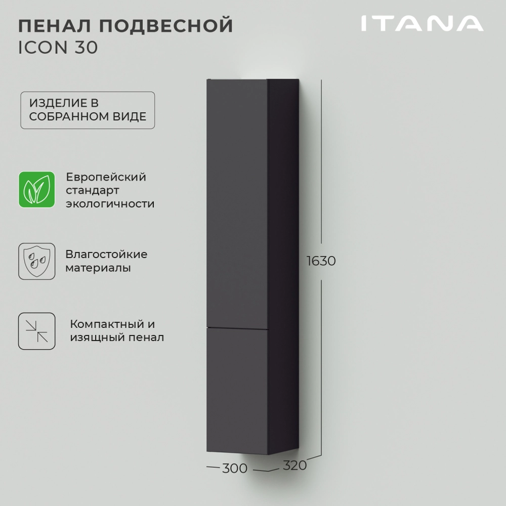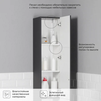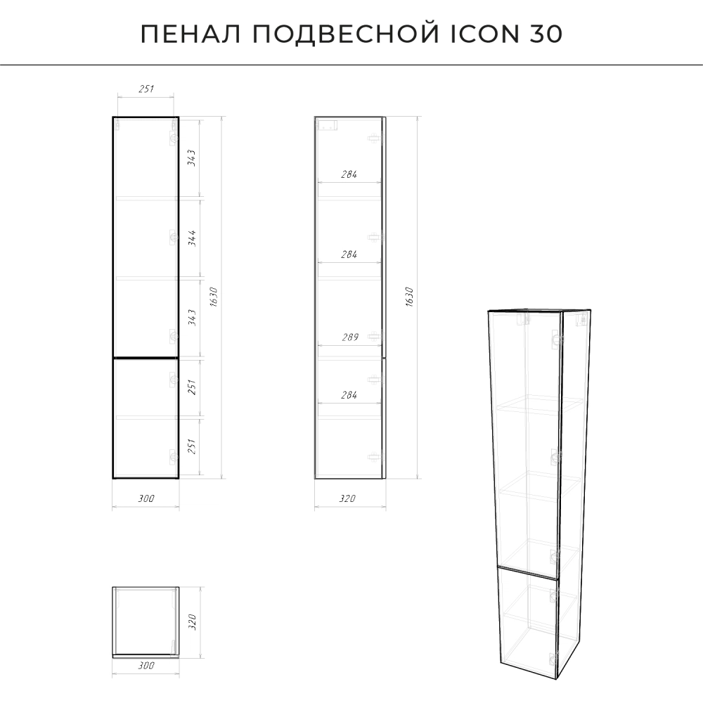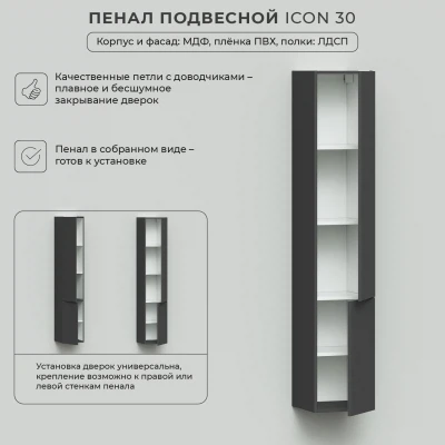 Пенал в ванную из коллекции Icon 30 - это сочетание природного декора. Шкаф-пенал поможет создать комфортные условия в ванной комнате. Благодаря его компактным размерам 300х320х1630 и настенному крепежу он занимает немного места и надежно закрепляется. Дверь шкафа универсальна, возможно установить на любую сторону, как правое, так и левое открывание. Подвесной пенал в ванную изготовлен из влагозащищенного МДФ, корпус и фасады покрыты высокоглянцевой ПВХ-пленкой, что обеспечивает ему привлекательный внешний вид, а также износостойкость и долговечность. Система push-to-open позволяет открывать распашную дверцу простым нажатием на фасад. Главное преимущество системы: отсутствие ручек на фасадах. Внутри шкафа полки, где можно рационально распределить и разместить все необходимые вещи для ванной комнаты. Полки пенала легко переставить, возможно регулировать расстояние их между собой. Для точного выбора пенала в ванную комнату рекомендуем обратиться к схеме замеров, которая находится на фото в карточке товара. Размеры изделия могут отличаться +/-1 см в связи со спецификой производства. Дополнить комплект можно тумбой с раковиной и зеркалом из коллекции Icon. Изделия коллекции качественные, функциональные и органически впишутся в популярные и современные интерьерные решения для ванных комнат. Шкаф-пенал для ванной комнаты доставляется в предварительно собранном виде, надежно упакован.
