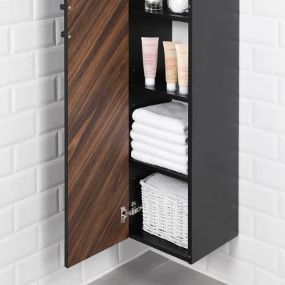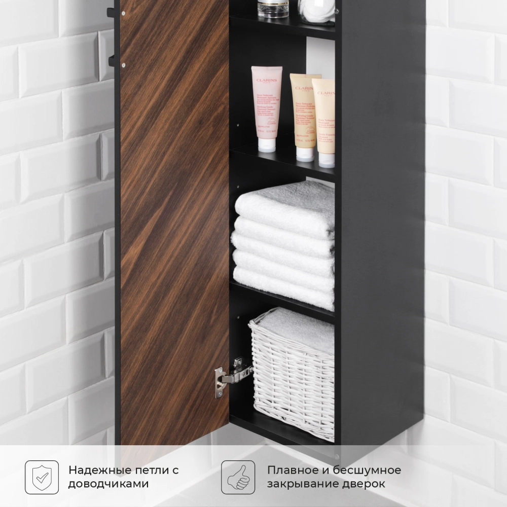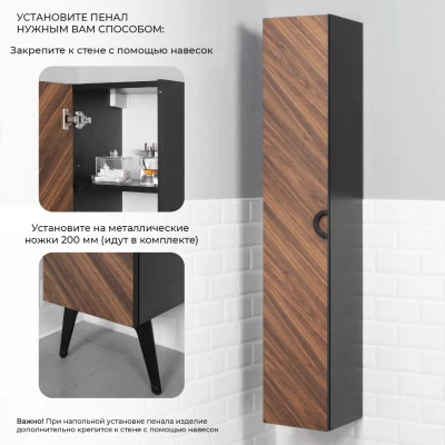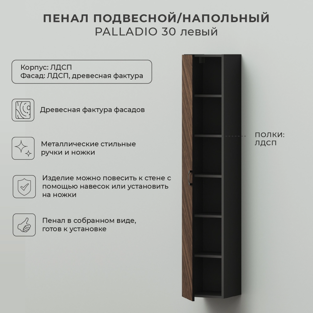 Пенал в ванную из коллекции Palladio 30 - это великолепное звучание современной классики, изящные пропорции и нестандартный подход к дизайну с сохранением функциональности. Шкаф-пенал поможет создать комфортные условия в ванной комнате. Благодаря его компактным размерам 300х300х1650 и настенному крепежу он занимает немного места и надежно закрепляется. Дверь шкафа для ванной с правосторонним открыванием. Пенал в ванную изготовлен из ламинированного ДСП, что обеспечивает ему привлекательный внешний вид, а также износостойкость и долговечность. Качественная фурнитура с доводчиками обеспечивает легкое открывание и плавное закрывание дверок. Дизайнерские металлические ручки с покрытием не только декоративный элемент, но и удобное решение, фасады остаются чистыми при постоянном открывании и закрывании. Внутри пенала полки, где можно рационально распределить и разместить все необходимые вещи для ванной комнаты. Полки пенала легко переставить, возможно регулировать расстояние их между собой. Пенал для ванной можно повестить на стену с помощью навесок или установить на металлические ножки. Для точного выбора пенала в ванную комнату рекомендуем обратиться к схеме замеров, которая находится на фото в карточке товара. Размеры изделия могут отличаться +/-1 см в связи со спецификой производства. Дополнить комплект можно тумбой с раковиной и зеркалом из коллекции Palladio. Изделия коллекции качественные, функциональные и органически впишутся в популярные и современные интерьерные решения для ванных комнат. Шкаф пенал для ванной комнаты доставляется в предварительно собранном виде, надежно упакован.
